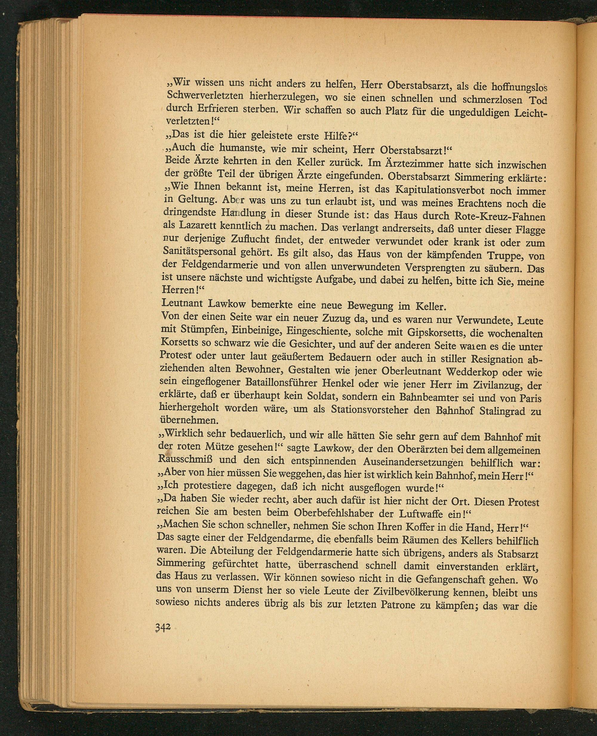 Von der einen Seite war ein neuer Zuzug da, und es waren nur Verwundete, Leute mit Stümpfen, Finbeinige, Fingeschiente, solche mit Gipskorsetts, die wochenalten Korsetts so schwarz wie die Gesichter, und auf der anderen Seite waien es die unter Protest oder unter laut geäußertem Bedauern oder auch in stiller Resignation ab- ziehenden alten Bewohner, Gestalten wie jener Oberleutnant Wedderkop oder wie sein eingeflogener Bataillonsführer Henkel oder wie jener Herr im Zivilanzug, der erKärte, daß er überhaupt kein Soldat, sondern ein Bahnbeamter sei und von Paris hierhergeholt worden wäre, um als Stationsvorsteher den Bahnhof Stalingrad zu übernehmen.