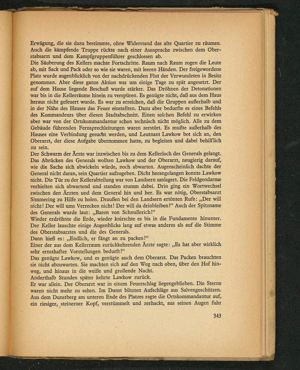 des Generals wurde laut:„Baron von Schnullerich Wieder erdrõhnte die Erde, wieder knirschte es bis in die Fundamente hinunter. Der Keller lauschte einige Augenblicke lang auf etwas anderes als auf die Stimme des Oberstabsarztes und die des Generals.