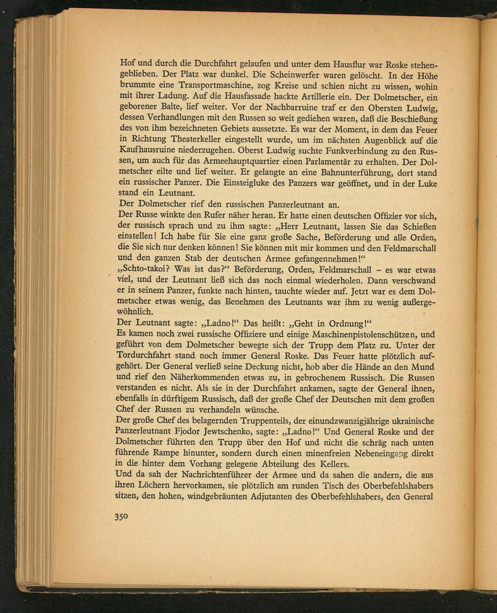 Hof und durch die Durchfahrt gelaufen und unter dem Hausflur war Roske stehen- geblieben. Der Platz war dunkel. Die Scheinwerfer waren gelöscht. In der Höhe brummte eine Transportmaschine, z0g Kreise und schien nicht zu wissen, wohin mit ihrer Ladung. Auf die Hausfassade hackte Artillerie ein. Der Polmetscher, ein geborener Balte, lief weiter. Vor der Nachbarruine traf er den Obersten Ludwig, dessen Verhandlungen mit den Russen so weit gedichen waren, daß die Beschießung des von ihm bezeichneten Gebiets aussetzte. Es war der Moment, in dem das Feuer in Richtung Theaterkeller eingestellt wurde, um im nächsten Augenblick auf die Kaufhausruine niederzugehen. Oberst Ludwig suchte Funkverbindung zu den Rus- sen, um auch für das Armeehauptquartier einen Parlamentär zu erhalten. Der Dol- metscher eilte und lief weiter. Er gelangte an eine Bahnunterführung, dort stand ein russischer Panzer. Die Einsteigluke des Panzers war geöffnet, und in der Luke stand ein Leutnant.
