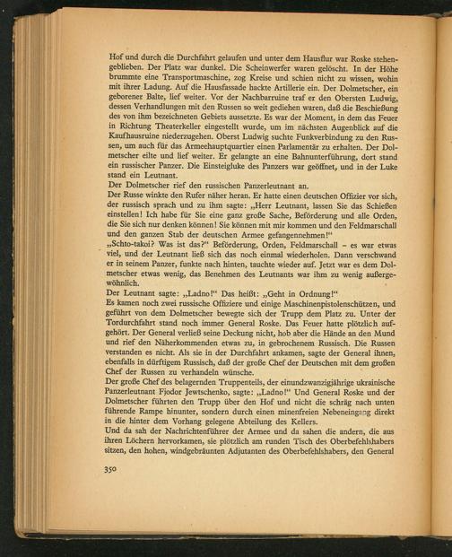 Der Russe winkte den Rufer näher heran. Er hatte einen deutschen Offizier vor sich, der russisch sprach und zu ihm sagte:„Herr Leutnant, lassen Sie das Schießen einstellen! Ich habe für Sie eine ganz große Sache, Beförderung und alle Orden, die Sie sich nur denken kõnnen! Sie kõnnen mit mir kommen und den Feldmarschall und den ganzen Stab der deutschen Armee gefangennehmen!“