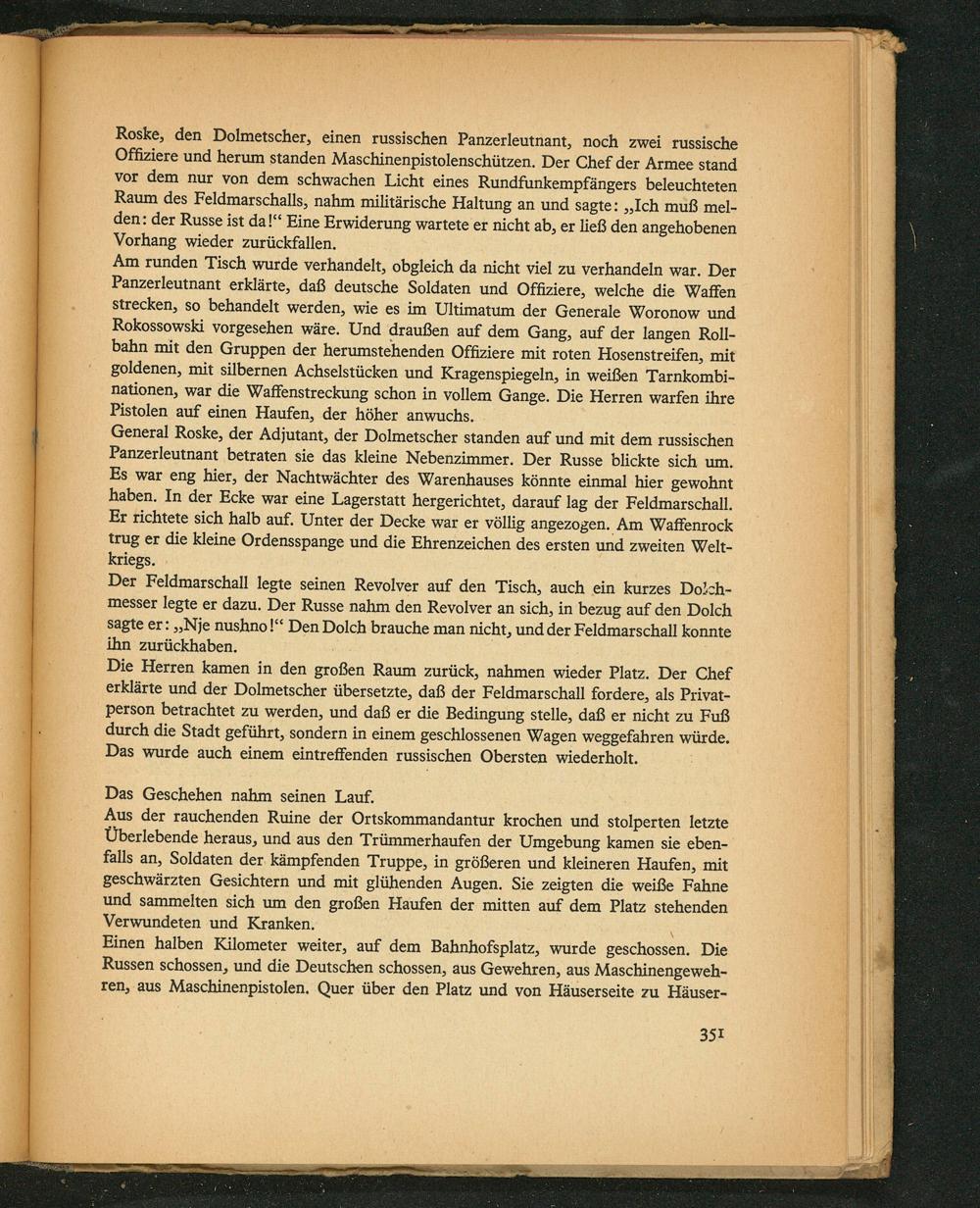 Roske, den Dolmetscher, einen russischen Panzerleutnant, noch zwei russische Offiiere und herum standen Maschinenpistolenschützen. Der Chef der Armee stand vor dem nur von dem schwachen Licht eines Rundfunkempfängers beleuchteten Raum des Feldmarschalls, nahm militärische Haltung an und Sagte:„Ich muß mel- den: der Russe ist da!“ Fine Erwiderung wartete er nicht ab, er ließ den angehobenen Vorhang wieder zurückfallen.