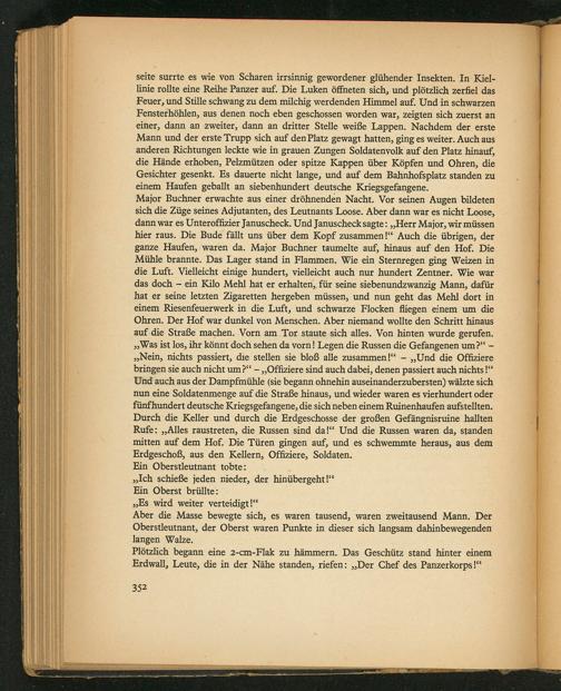 seite surrte es wie von Scharen irrsinnig gewordener glühender Insekten. In Kiel - linie rollte eine Reihe Panzer auf. Die Luken öffneten sich, und plõtzlich zerfiel das Feuer, und Stille schwang zu dem milchig werdenden Himmel auf. Und in schwarzen Fensterhöhlen, aus denen noch eben geschossen worden war, zeigten sich zuerst an einer, dann an zweiter, dann an dritter Stelle weiße Lappen. Nachdem der erste Mann und der erste Trupp sich auf den Platz gewagt hatten, ging es weiter. Auch aus anderen Richtungen leckte wie in grauen Zungen Soldatenvolk auf den Platz hinauf, die Hände erhoben, Pelzmützen oder spitze Kappen über Köpfen und Ohren, die Gesichter gesenkt. Es dauerte nicht lange, und auf dem Bahnhofsplatz standen zu einem Haufen geballt an siebenhundert deutsche Kriegsgefangene. Major Buchner erwachte aus einer dröhnenden Macht. Vor seinen Augen bildeten sich die Züge seines Adjutanten, des Leutnants Loose. Aber dann war es nicht Loose, dann war es Unteroffizier Januscheck. Und Januscheck sagte:„Herr Major, wir müssen hier raus. Die Bude fällt uns über dem Kopf zusammen!“ Auch die übrigen, der ganze Haufen, waren da. Major Buchner taumelte auf, hinaus auf den Hof. Die Mühle brannte. Das Lager stand in Flammen. Wie ein Sternregen ging Weizen in die Luft. Vielleicht einige hundert, vielleicht auch nur hundert Zentner. Wie war das doch— ein Kilo Mehl hat er erhalten, für seine siebenundzwanzig Mann, dafür hat er seine letzten Zigaretten hergeben müssen, und nun geht das Mehl dort in einem Riesenfeuerwerk in die Luft, und schwarze Flocken fliegen einem um die Ohren. Der Hof war dunkel von Menschen. Aber niemand wollte den Schritt hinaus auf die Straße machen. Vorn am Tor staute sich alles. Von hinten wurde gerufen. „Was ist los, ihr könnt doch sehen da vorn! Legen die Russen die Gefangenen um?“— „Nein, nichts passiert, die stellen sie bloß alle zusammen!“—„Und die Offiziere bringen sie auch nicht um?“— Offiziere sind auch dabei, denen passiert auch nichts!“ Und auch aus der Dampfmũühle Eie begann ohnehin auseinanderzubersten) wälzte sich nun eine Soldatenmenge auf die Straße hinaus, und wieder waren es vierhundert oder fünf hundert deutsche Kriegsgefangene, die sich neben einem Ruinenhaufen aufstellten. Durch die Keller und durch die Erdgeschosse der großen Gefängnisruine hallten Rufe;„Alles raustreten, die Russen sind da!“ Und die Russen waren da, standen mitten auf dem Hof. Die Türen gingen auf, und es schwemmte heraus, aus dem Erdgeschoß, aus den Kellern, Offiziere, Soldaten. Ein Oberstleutnant tobte: „Ich schieße jeden nieder, der hinübergeht!“ Ein Oberst brüllte: „Es wird weiter verteidigt!“ Aber die Masse bewegte sich, es waren tausend, waren zweitausend Mann. Der Oberstleutnant, der Oberst waren Punkte in dieser sich langsam dahinbewegenden langen Walze. Plõtzlich begann eine 2-cm-Flak zu hämmern. Das Geschütz stand hinter einem Erdwall, Leute, die in der Nähe standen, riefen:„Der Chef des Panzerkorps E