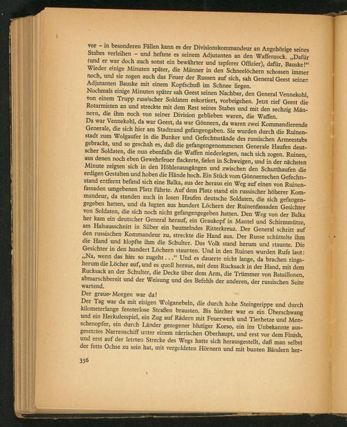 Da war Vennekohl, da war Geest, da war Gönnern, da waren zwei Kommandierende Generale, die sich hier am Stadtrand gefangengaben. Sie wurden durch die Ruinen- stadt zum Wolgaufer in die Bunker und Gefechtsstände des russischen Armeestabs gebracht, und so geschah es, daß die gefangengenommenen Generale Haufen deut- Scher Soldaten, die nun ebenfalls die Waffen niederlegten, nach sich zogen. Ruinen, aus denen noch eben Gewehrfeuer flackerte, fielen in Schweigen, und in der nächsten Minute zeigten sich in den Hõhlenausgängen und zwischen den Schutthaufen die erdigen Gestalten und hoben die Hãnde hoch. Fin Stück vom Gõnnernschen Gefechts- stand entfernt befand sich eine Balka, aus der heraus ein Weg auf einen von Ruinen- fassaden umgebenen Platz führte. Auf dem Platz stand ein russischer höherer Kom- mandeur, da standen auch in losen Haufen deutsche Soldaten, die sich gefangen- gegeben hatten, und da lugten aus hundert Löchern der Ruinenfassaden Gesichter von Soldaten, die sich noch nicht gefangengegeben hatten. Den Weg von der Balka her kam ein deutscher General herauf, ein Graukopf in Mantel und Schirmmütze, am Halsausschnitt in Silber ein baumelndes Ritterkreuz. Der General schritt auf den russischen Kommandeur zu, streckte die Hand aus. Der Russe schüttelte ihm die Hand und Kopfte ihm die Schulter. Das Volk stand herum und staunte. Die Gesichter in den hundert Löchern staunten. Und in den Ruinen wurden Rufe laut: „Na, wenn das hier so zugeht.. Und es dauerte nicht lange, da brachen rings- herum die Löcher auf, und es quoll heraus, mit dem Rucksack in der Hand, mit dem Rucksack an der Schulter, die Decke über dem Arm, die Trümmer von Bataillonen, abmarschbereit und der Weisung und des Befehls der anderen, der russischen Seite wartend.
