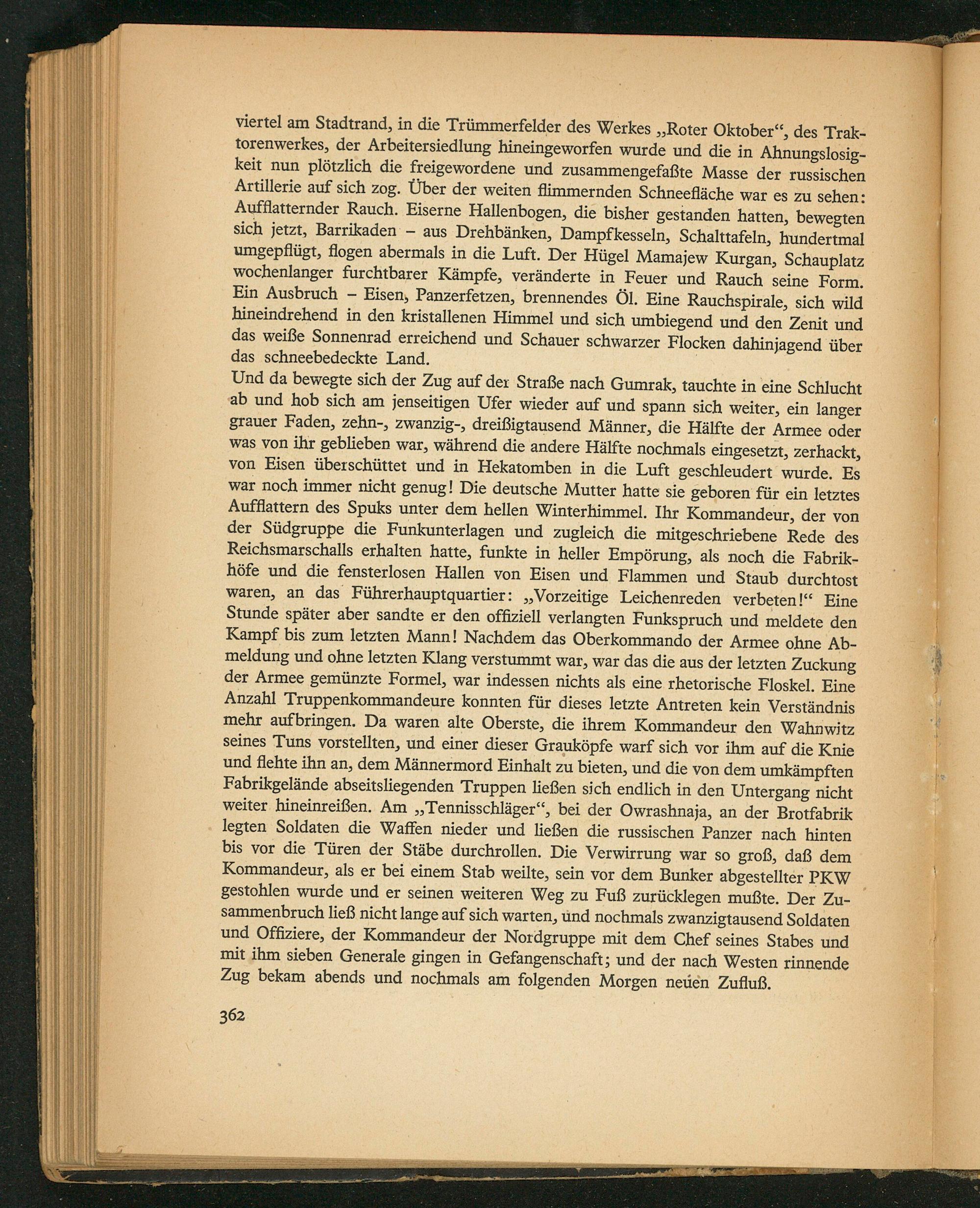 Und da bewegte sich der Zug auf᷑ der Straße nach Gumrak, tauchte in eine Schlucht ab und hob sich am jenseitigen Ufer wieder auf und Spann sich weiter, ein langer grauer Faden, zehn-, zwanzig-, dreißigtausend Männer, die Hãlfte der Armee oder was von ihr geblieben war, wãhrend die andere Hãlfte nochmals eingesetzt, zerhackt, von Fisen überschüttet und in Hekatomben in die Luft geschleudert wurde. Es war noch immer nicht genug! Die deutsche Mutter hatte sie geboren für ein letztes Aufflattern des Spuks unter dem hellen Winterhimmel. Ihr Kommandeur, der von der Südgruppe die Funkunterlagen und zugleich die mitgeschriebene Rede des Reichsmarschalls erhalten hatte, funkte in heller Empörung, als noch die Fabrik- höfe und die fensterlosen Hallen von Fisen und Flammen und Staub durchtost waren, an das Führerhauptquartier:„Vorzeitige Leichenreden verbeten!“ Eine Stunde spãter aber sandte er den offiiell verlangten Funkspruch und meldete den Kampf bis zum letzten Mann! Nachdem das Oberkommando der Armee ohne Ab- meldung und ohne letzten Klang verstummt war, war das die aus der letↄten Zuckung der Armee gemünzte Formel, war indessen nichts als eine rhetorische Floskel. Eine Anzahl Truppenkommandeure konnten für dieses letzte Antreten kein Verstãndnis mehr aufbringen. Da waren alte Oberste, die ihrem Kommandeur den Wahnwitz seines Tuns vorstellten, und einer dieser Graukõpfe warf sich vor ihm auf die Knie und flehte ihn an, dem Männermord Einhalt zu bieten, und die von dem umkãmpften Fabrikgelände abseitsliegenden Truppen ließen sich endlich in den Untergang nicht weiter hineinreißen. Am„Tennisschläger“, bei der Owrashnaja, an der Brotfabrik legten Soldaten die Waffen nieder und ließen die russischen Panzer nach hinten bis vor die Türen der Stäbe durchrollen. Die Verwirrung war so groß, daß dem Kommandeur, als er bei einem Stab weilte, sein vor dem Bunker abgestellter PKW
