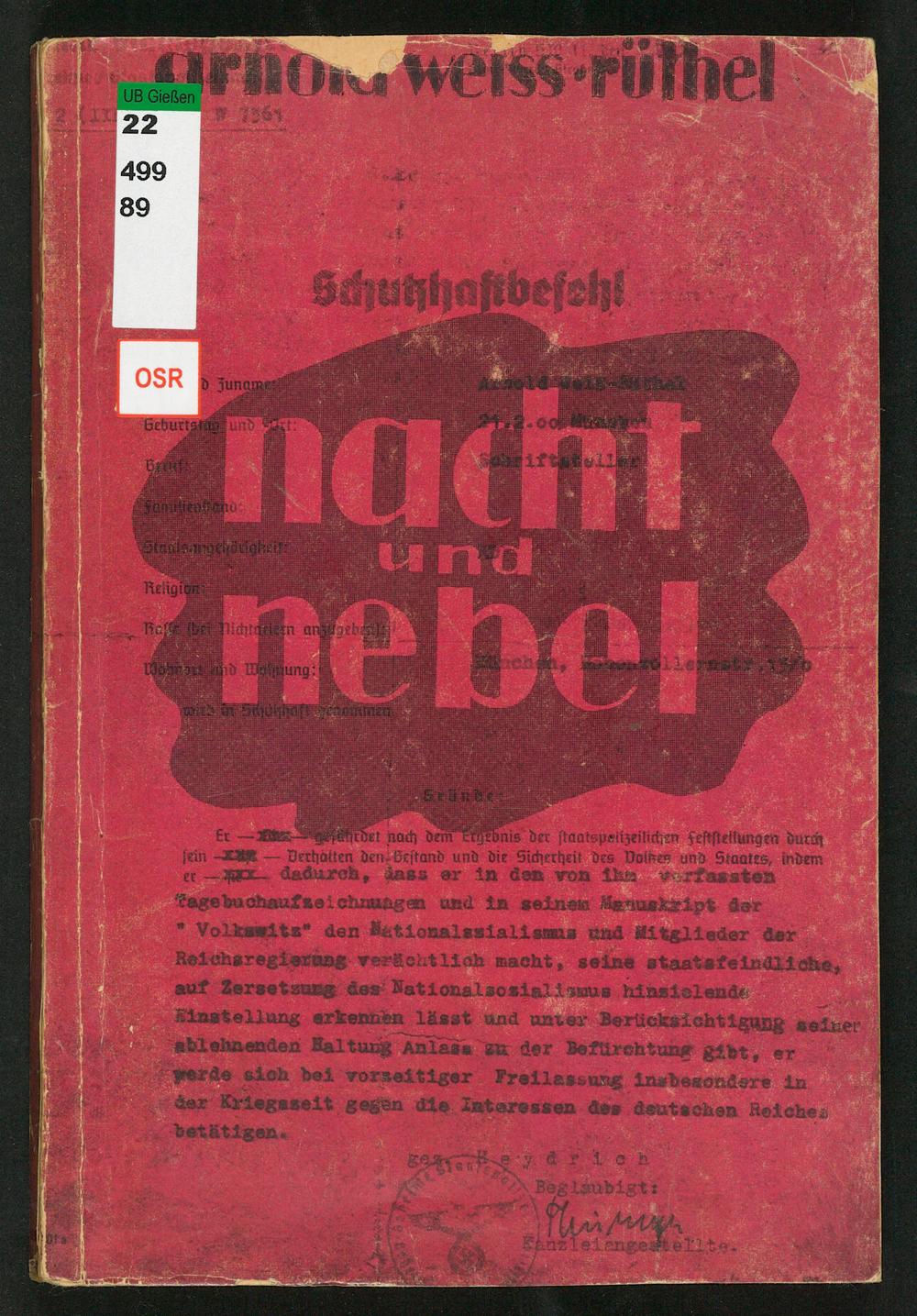 Nacht und Nebel : Aufzeichnung aus fünf Jahren Schutzhaft / Arnold Weiss-Rüthel