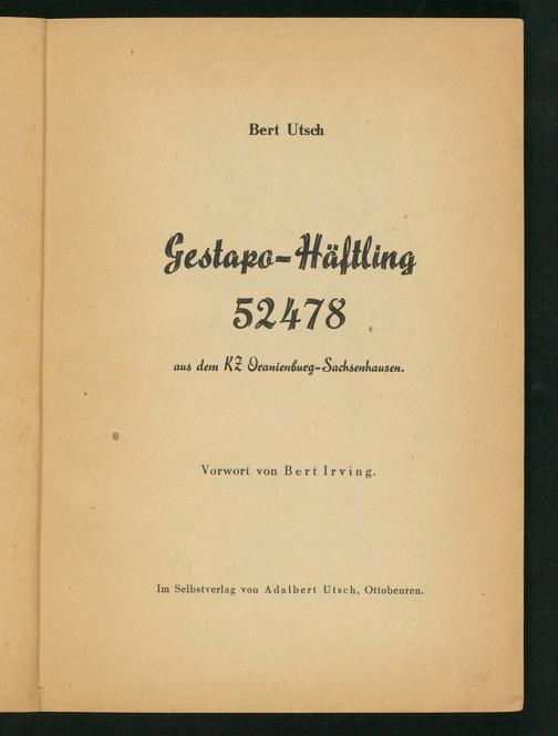 Gestapo-Häftling 52478 aus dem KZ Oranienburg-Sachsenhausen / Bert Utsch ; Vorwort von Bert Irving ; Zeichnung des Buchtitels und der Bildeinlage von Max Pöppel