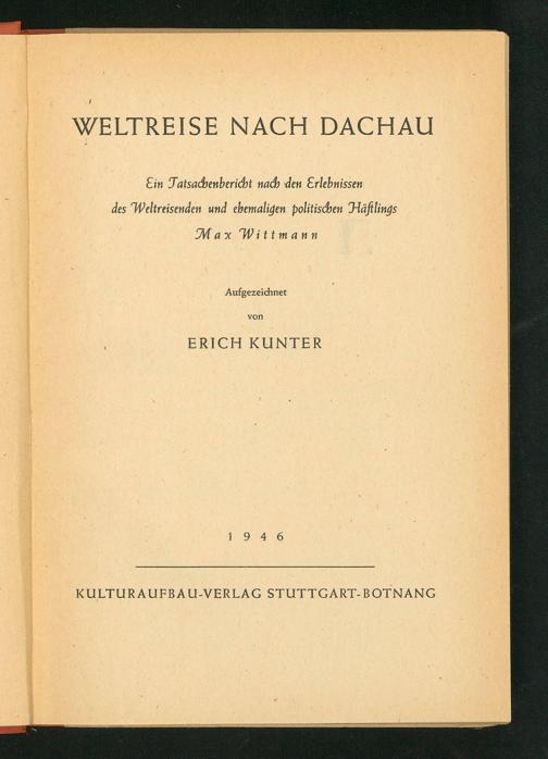 Weltreise nach Dachau : ein Tatsachenbericht nach den Erlebnissen des Weltreisenden und ehemaligen politischen Häftlings / Max Wittmann ; aufgezeichnet von Erich Kunter