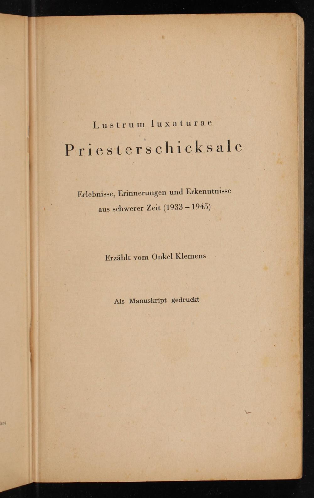 Priesterschicksale : Lustrum luxaturae : Erlebnisse, Erinnerungen und Erkenntnisse aus schwerer Zeit (1933 - 1945) / erzählt vom Onkel Klemens