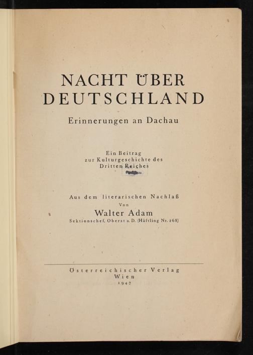 Nacht über Deutschland : Erinnerungen an Dachau ; ein Beitrag zur Kulturgeschichte des Dritten Reiches ; aus dem literarischen Nachlaß / von Walter Adam