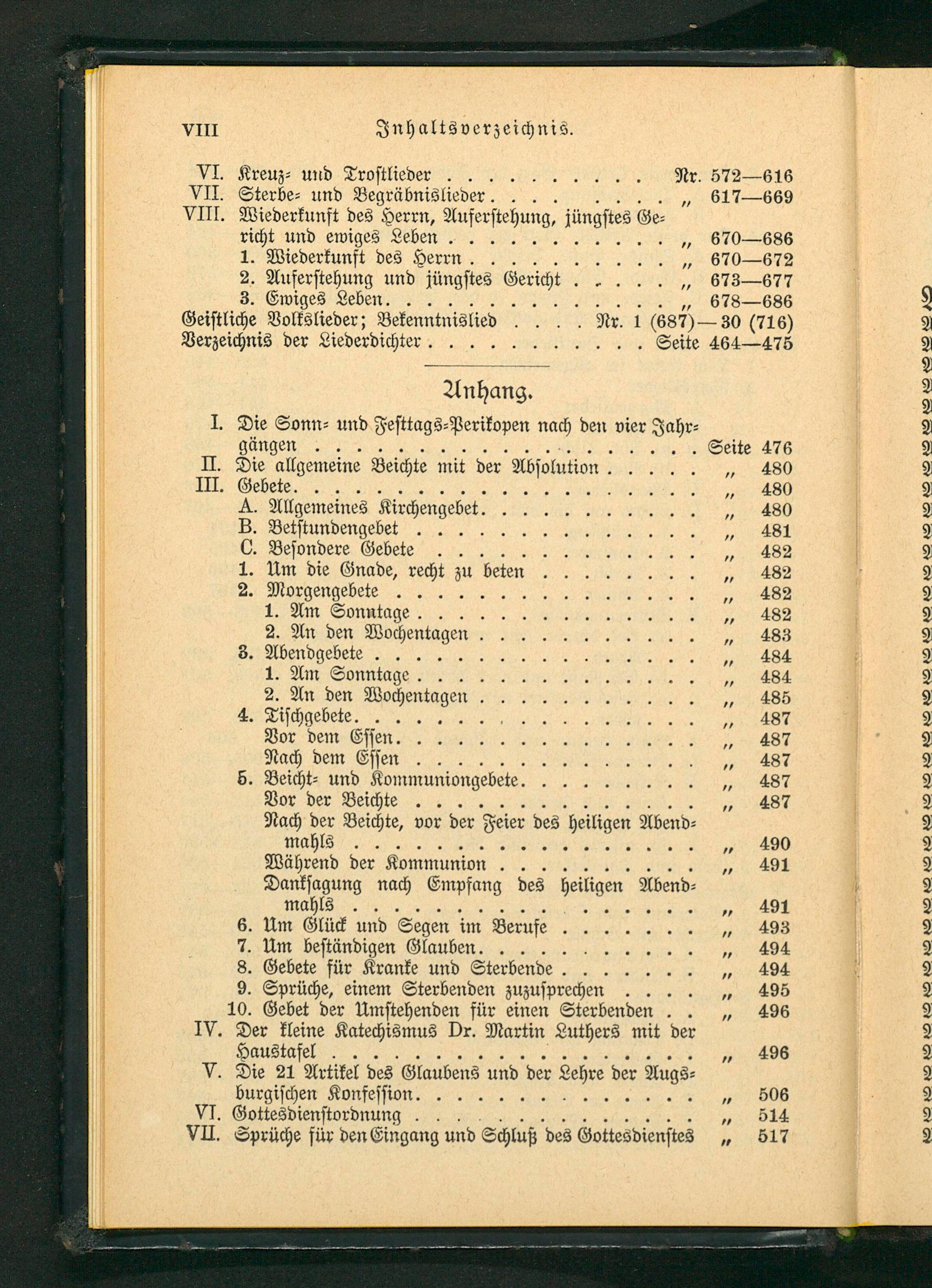 richt und ewiges Teheen„ 670—686 1. Wiedertunft des Hernn„ 670—672 2. Auferstehung und jüngstes Gericchh....„ 673—677 5. Swiges Lebennn 678—686 Geistliche Volkslieder; Bekenntnislied...Nr. 1(687)—30(716) Verzeichnis der Liederdichter D Seite 464— 475 Anhang. I. Die Sonn⸗ und Festtags⸗Perikopen nach den vier Jahr⸗ ängen:· m Seite 476 II. Die allgemeine Beichte mit der Absolution„ 480 11. Gehete„„ W„ 480 . Allgemeines Kirchengebell„ 480 B. Betstundengeber.„ 481 (C. Beiondere Gedettetete„, 282 1. Um die Gnade, recht zu bettn 82 2. Morgengebetee ũw.„ 482 4. Am Sonntage 3„ 482 2. An den Wochentageen„ 483 5. Abeudgebee„„„484 1. Am Sountags„484 2. An den Wochentagen„ 485 4. Tischgebete„487 Vor dem Csseinnn.... q„ 487 Nach dem Essen„ 27 5. Beicht⸗ und Kommuniongebete„, 487 Vor der Peichte„ 487 Nach der Beichte, vor der Feier des heiligen Abend⸗ mahl ́„ 490 Während der Kommunion„ 491 Danksagung nach Empfang des heiligen Abend⸗ mahlds wga„ 491 6. Um Glück und Segen im Beruffe„ 293 7. Um beständigen Glauben„ 494 8. Gebete für Kranke und Sterbendde.„ 494 9. Sprüche, einem Sterbenden zuzusprechen.„ 495 10. Gebet der Umstehenden für einen Sterbenden.„ 496 IV. Der kleine Katechismus Dr. Martin Luthers mit der Haustast„ 496 V. Die 21 Artikel des Glaubens und der Lehre der Augs⸗ burgischen Konfessionunn 3„ 5006 VI. Gotte dienstorynunn).ũ—.„ 514