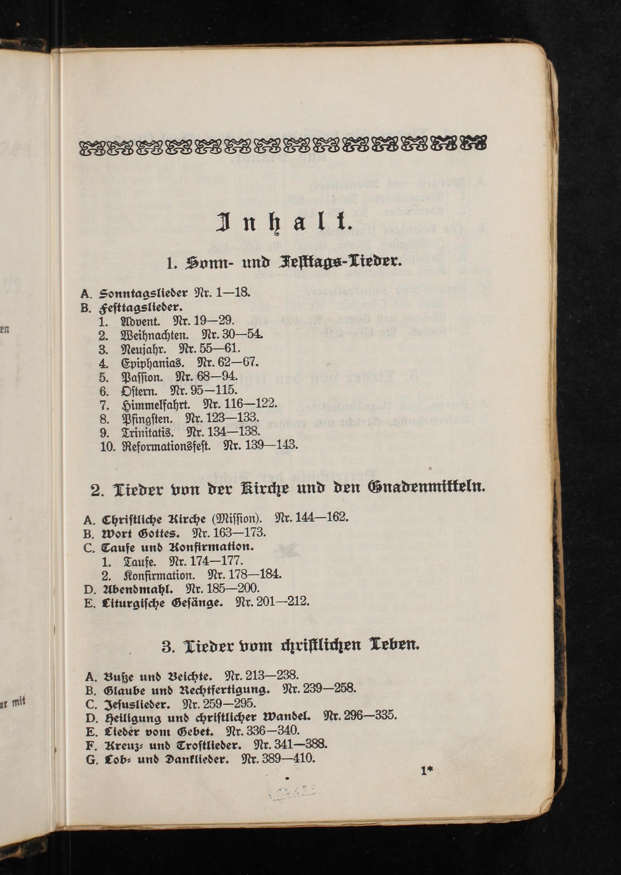 B. Festtagslieder. 1. Advent. Nr. 19—29. 2. Weihnachten. Nr. 30—54. 3. Neujahr. Nr. 55—61. 4. Epiphanias. Nr. 62—67. 5. Passion. Nr. 68—94. 6. Ostern. Nr. 95—115. 7. Himmelfahrt. Nr. 116—122. 8. Pfingsten. Nr. 123—133. 9. Trinitatis. Nr. 134—138. 10. Reformationsfest. Nr. 139—143.