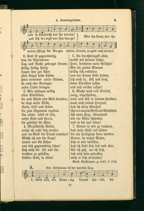 2. Gott ist gegenwärtig, dem die Cherubinen Tag und Nacht gebeuget dienen; heilig, heilig, heilig singen ihm zur Ehre aller Engel hohe Chöre. Herr vernimm unsre Stimm, da auch wir Geringen unsre Opfer bringen. 3. Wir entsagen willig allen Eitelkeiten, die uns Sünd und Welt bereiten; da liegt unser Wille, Seele, Leib und Leben dir zum Eigentum ergeben. Du allein sollst es sein, unser Gott und Herre, dir gebührt die Ehre. 4. Majestätisch Wesen, möcht ich recht dich preisen und im Geist dir Dienst erweisen! Möcht ich wie die Engel immer vor dir stehen und dich gegenwärtig sehen! Laß mich dir für und für trachten zu gefallen, liebster Gott, in allen!