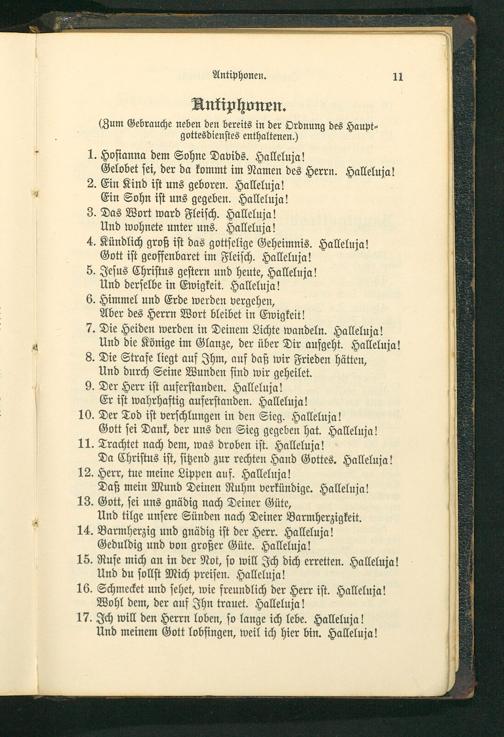 Hosianna dem Sohne Davids. Halleluja! Gelobet sei, der da kommt im Namen des Herrn. Halleluja! „Ein Kind ist uns geboren. Halleluja! Ein Sohn ist uns gegeben. Halleluja! Das Wort ward Fleisch. Halleluja! Und wohnete unter uns. Halleluja! Kündlich groß ist das gottselige Geheimnis. Halleluja! Gott ist geoffenbaret im Fleisch. Halleluja! „Jesus Christus gestern und heute, Halleluja! Und derselbe in Ewigkeit. Halleluja! Himmel und Erde werden vergehen, Aber des Herrn Wort bleibet in Ewigkeit! Die Heiden werden in Deinem Lichte wandeln. Halleluja! Und die Könige im Glanze, der über Dir aufgeht. Halleluja!
