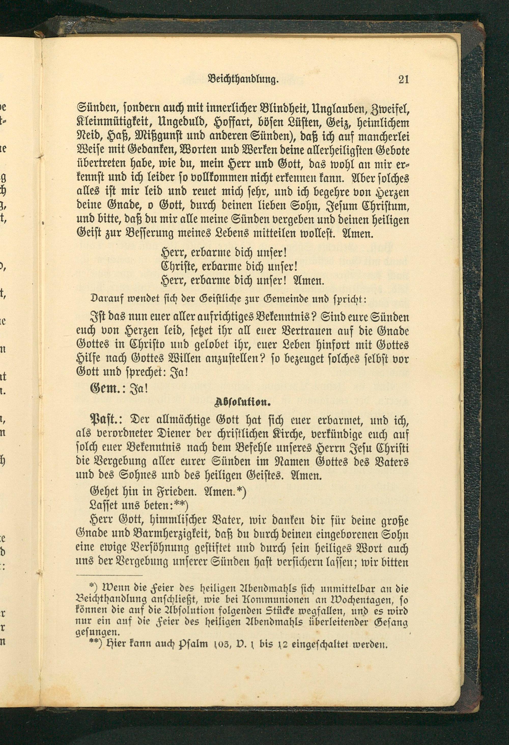 ) Wenn die Feier des heiligen Abendmahls sich unmittelbar an die Beichthandlung anschließt, wie bei Hommunionen an Wochentagen, so können die auf die Absolution folgenden Stücke wegfallen, und es wird nur ein auf die Feier des heiligen Abendmahls überleitender Gesang gesungen.