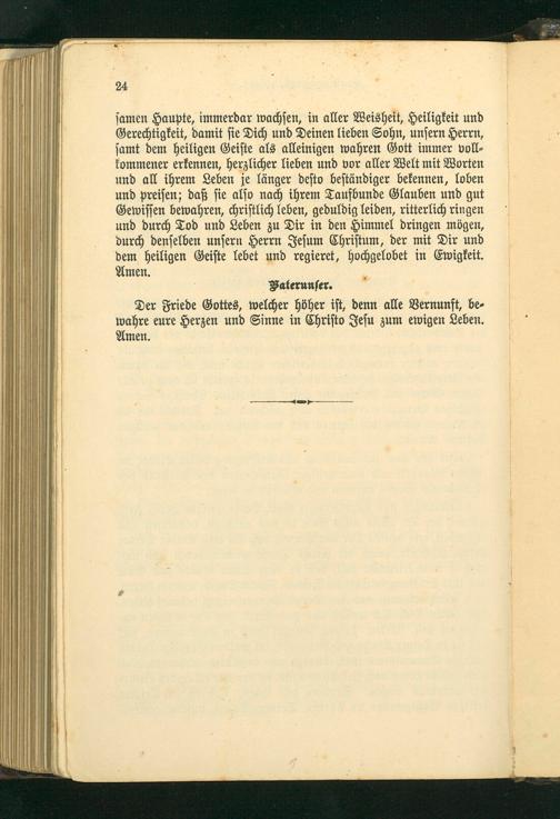 samen Haupte, immerdar wachsen, in aller Weisheit, Heiligkeit und Gerechtigkeit, damit sie Dich und Deinen lieben Sohn, unsern Herrn, samt dem heiligen Geiste als alleinigen wahren Gott immer voll⸗ kommener erkennen, herzlicher lieben und vor aller Welt mit Worten und all ihrem Leben je länger desto beständiger bekennen, loben und preisen; daß sie also nach ihrem Taufbunde Glauben und gut Gewissen bewahren, christlich leben, geduldig leiden, ritterlich ringen und durch Tod und Leben zu Dir in den Himmel dringen mögen, durch denselben unsern Herrn Jesum Christum, der mit Dir und dem heiligen Geiste lebet und regieret, hochgelobet in Ewigkeit. Amen. Vaterunser.
