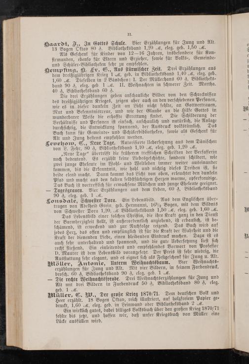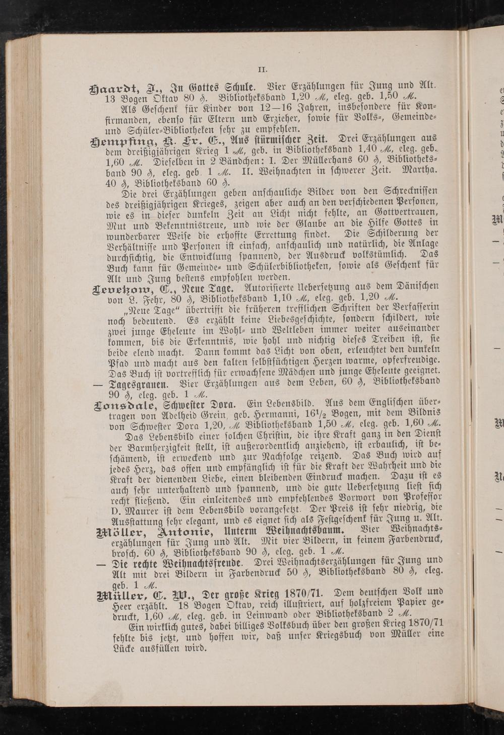 V beide elend macht. Dann kommt das Licht von oben, erleuchtet den dunkeln Pfad und macht aus den kalten selbstsüchtigen Herzen warme, opferfreudige. Das Buch ist vortrefflich für erwachsene Mädchen und junge Eheleute geeignet. 0— Tagesgrauen. Vier Erzählungen aus dem Leben, 60 0, Bibliotheksband * 90 0, eleg. geb. 1 M. Lonsdale, Schwester Dora. Ein Lebensbild. Aus dem Englischen über— tragen von Adelheid Grein, geb. Hermanni, 16½ Bogen, mit dem Bildnis von Schwester Dora 1,20, VĩWÜ Bibliotheksband 1,50=., eleg. geb. 1,60. ‚— Das Lebensbild einer solchen Christin, die ihre Kraft ganz in den Dienst der Barmherzigkeit stellt, ist außerordentlich anziehend, ist erbaulich, ist be— schämend, ist erweckend und zur Nachfolge reizend. Das Buch wird auf jedes Herz, das offen und empfänglich ist für die Kraft der Wahrheit und die Hraft der dienenden Liebe, einen bleibenden Eindruck machen. Dazu ist es * auch sehr unterhaltend und spannend, und die gute Uebersetzung liest sich recht fließend. Ein einleitendes und empfehlendes Vorwort von Professor D. Maurer ist dem Lebensbild vorangesetzt. Der Preis ist sehr niedrig, die Ausstattung sehr elegant, und es eignet sich als Festgeschenk für Jung u. Alt. möller, Antonie, Unterm Weihnachtsbaum. Vier Weihnachts⸗ ö erzählungen für Jung und Alt. Mit vier Bildern, in feinem Farbendruck, brosch. 60 h), Bibliotheksband 90 s, eleg. geb. 1 W. — Die rechte Weihnachtsfrende. Drei Weihnachtserzählungen für Jung und Alt mit' drei Bildern in Farbendruck 50), Bibliotheksband 80 h, eleg. geb. 1 M. Müller, C. W., Der große Krieg 1870/71. Dem deutschen Volk und Heer erzählt. 18 Bogen Oktav, reich illustriert, auf holzfreiem Papier ge⸗ druckt, 1,60, eleg. geb. in Leinwand oder Bibliotheksband 2 H. Ein wirklich gutes, dabei billiges Volksbuch über den großen Krieg 1870/71 fehlte bis jetzt, und hoffen wir, daß unser Kriegsbuch von Müller eine Lücke ausfüllen wird.