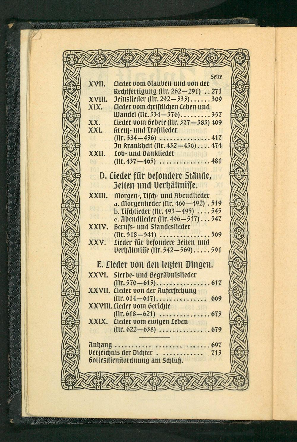 XXVI. Sterbe⸗ und Begräbnislieder (Ir. 570-613) XXVII. Cieder von der Auferstehung (Ir. 614-67) XXVIIll. Cieder vom berichte (r. 618-62l) XXIX. Lieder vom ewigen Leben (ur. 22— 58).
