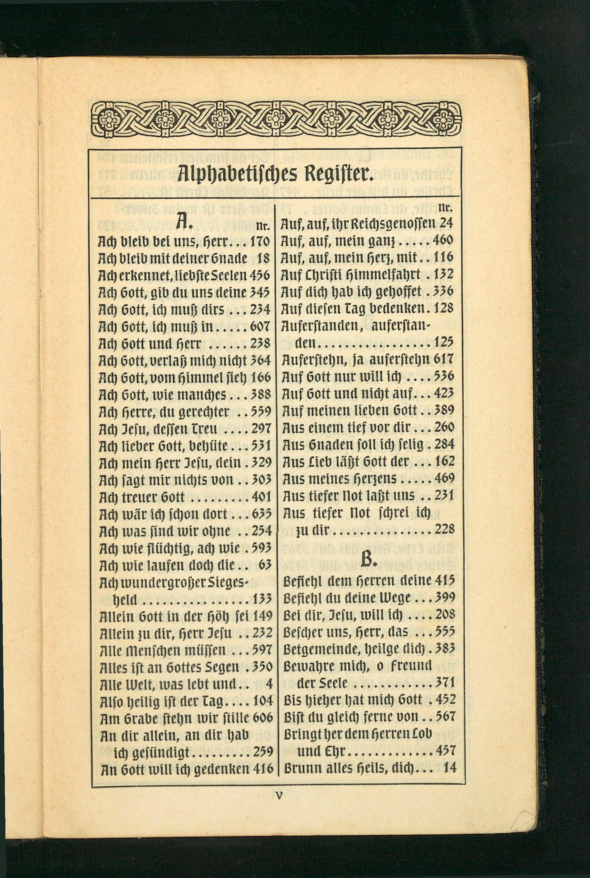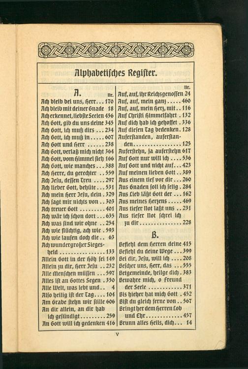 Auferstehn, ja auferstehn 617 Auf Gott nur will ich.. 536 Auf Gott und nicht auf. 423 Auf meinen lieben Gott.. 389 Aus einem tief vor dir... 260 Aus 6naden soll ich selig. 284 Aus Lieb läßt Gott der..162 Aus meines herzens.... 469 Aus tiefer Not laßt uns.. 231 Nus tiefer Not schrei ich