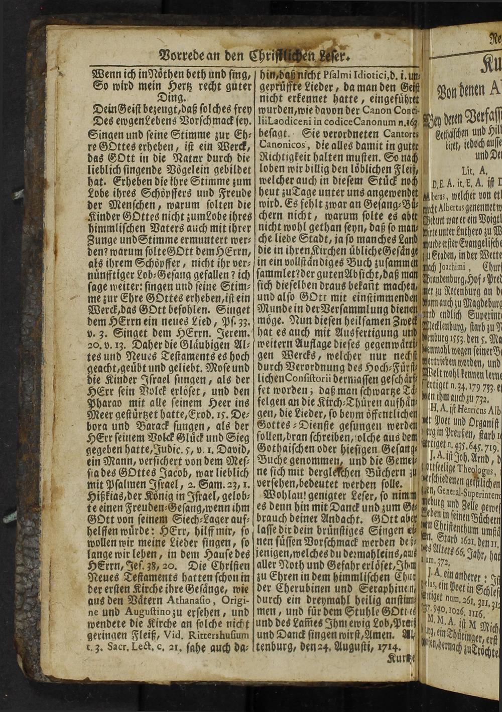 welcher auch in diesem Stuͤck noch I P. A. it. E. A, ist E heut zu Tage unter uns angewendet ens, welcher vonͤett wird. Es fehlt zwar an Gesang⸗Bie ntAdenwgenenllett chern nicht, warum solte es abel nicht wohl gethan seyn, daß so math⸗ che liebe Stadt, ja so manches Land die in ihren Kirchen uͤbliche Gesaͤnge in ein vollstaͤndiges Buch zusammen sammletꝛ der guten Absicht, daß man sich dieselben draus bekañt machen, und also GOtt mit einstimmenden Munde in der Versammlung dieneh moͤge. Nun diesen heilsamen Zweil hat es auch mit Ausfertigung un weitern Auflage dieses gegenwaͤrtj gen Wercks, welcher nuͤr nechst durch Verordnung des Hoch⸗Fuͤrft lichen Consistorũ dermassen gescharft fet worden; daß man schwartze Ta⸗ felgen an die Kirch⸗Thuͤren aufhaͤht gen, die Lieder, so beym oͤffentlichen Gottes⸗Dienste gesungen werden sollen, bran schreiben, olche aus den Gothaischen oder hiesigen Gesang⸗ Buche genommen, und die Gemeß⸗ ne sich mit dergleschen Buͤchern versehen, bedeutet werden u Wohlau! genigter Leser, so nim