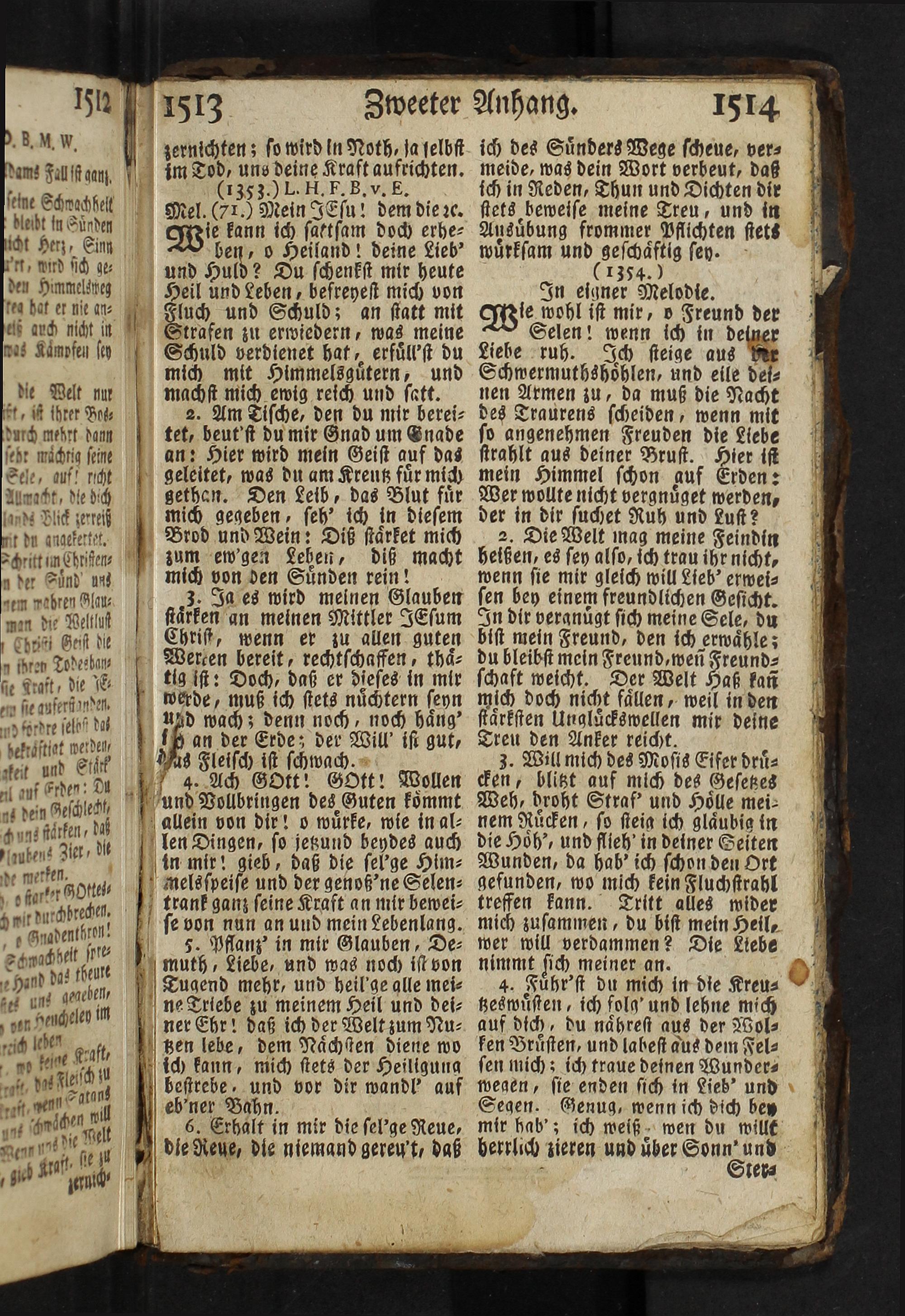 ich des Suͤnders Wege scheue, ver⸗ meide, was dein Wort verbeut, daß ich in Reden, Thun und Dichten dir stets beweise meine Treu, und in Ausuͤbung frommer Pflichten stets wuͤrksam und geschaͤftig sey. (1354.0 In eigner Melodie. Wie wohl ist mir, o Freund der Selen! wenn ich in deiner Liebe ruh. Ich steige aus Vr Schwermuthshoͤhlen, und eile dei⸗ nen Armen zu, da muß die Nacht des Traurens scheiden, wenn mit so angenehmen Freuden die Llebe strahlt aus deiner Brust. Hier ist mein Himmel schon auf Erden: Wer wollte nicht vergnuͤget werden, der in dir suchet Ruh und Lust?