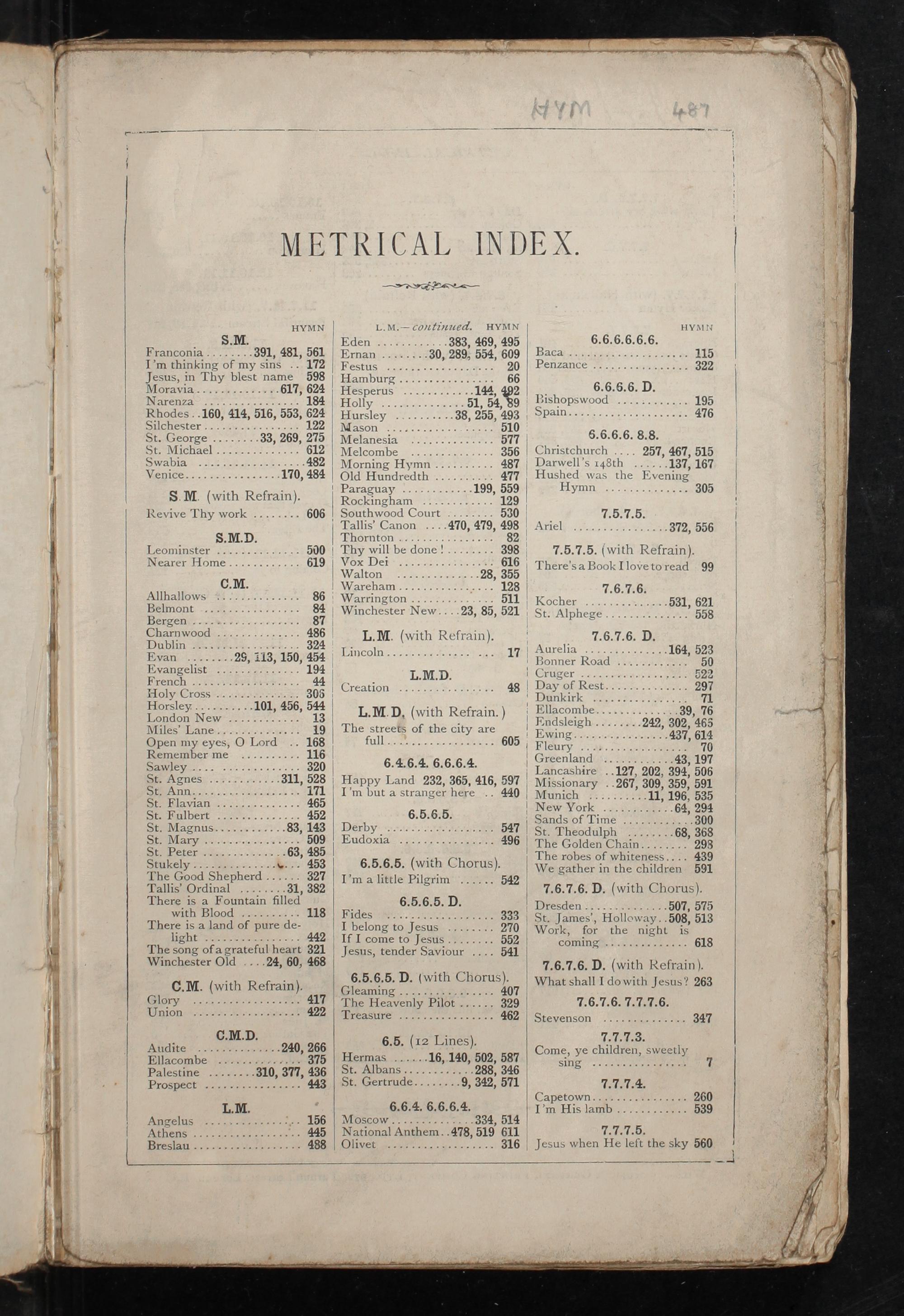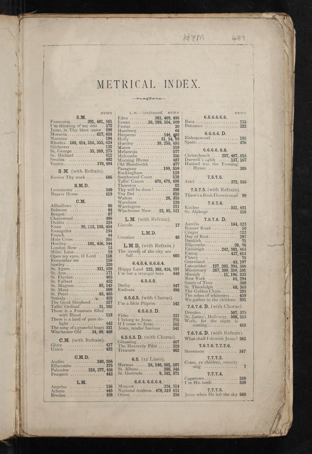 Hursley 38, 255, 493 Mason 5¹1⁰ MolaneSi E 57⁷7 Melcombe. 356 Morning Hymn.. 487 Old Hundredh 477⁷ Paraguay 199, 559 Rockingham 129