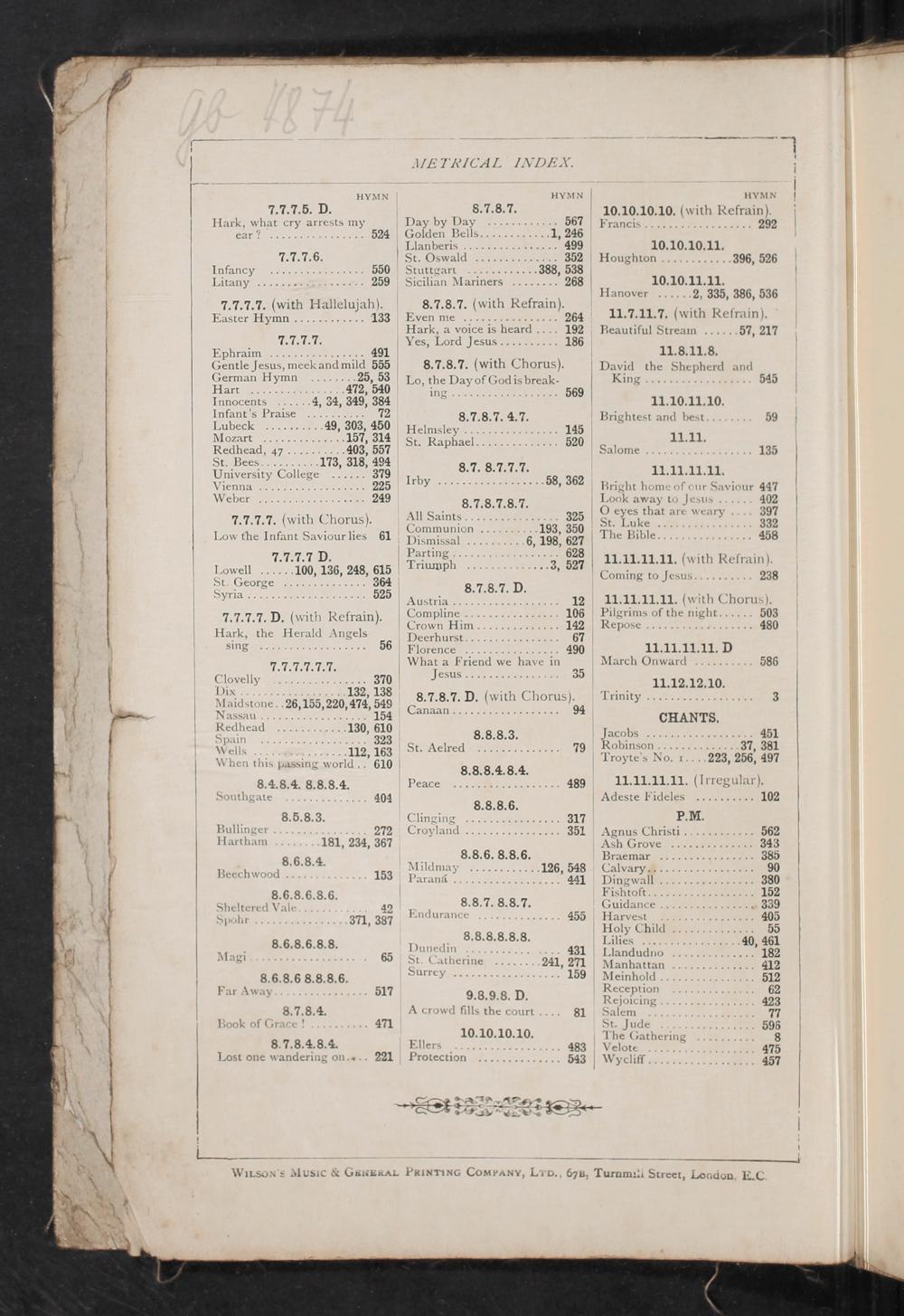 Lubeck 249, 303, 45⁵⁰ Mozart 15⁵⁷, 3¹⁴ Redhead, 47. 403, 557 St. Bees 173, 318, 494 University College 379 Viennas 2²⁵ Weber 249