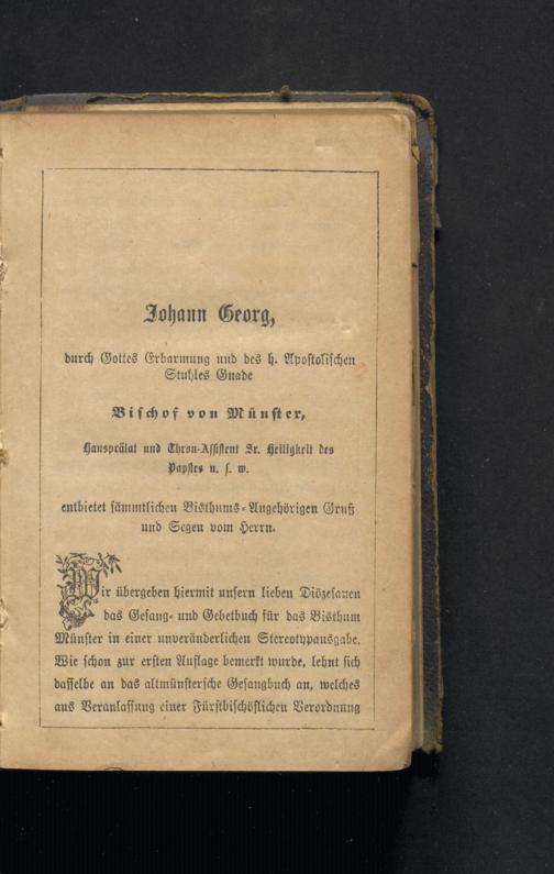 ir übergeben hiermit unsern lieben Diözesanen das Gefang- und Gebetbuch für das Bisthum Münster in einer unveränderlichen Stereotypausgabe. Wie schon zur ersten Auflage bemerkt wurde, lehnt sich dasselbe an das altmünstersche Gesangbuch an, welches aus Veranlassung einer Fürstbischöflichen Berordnung