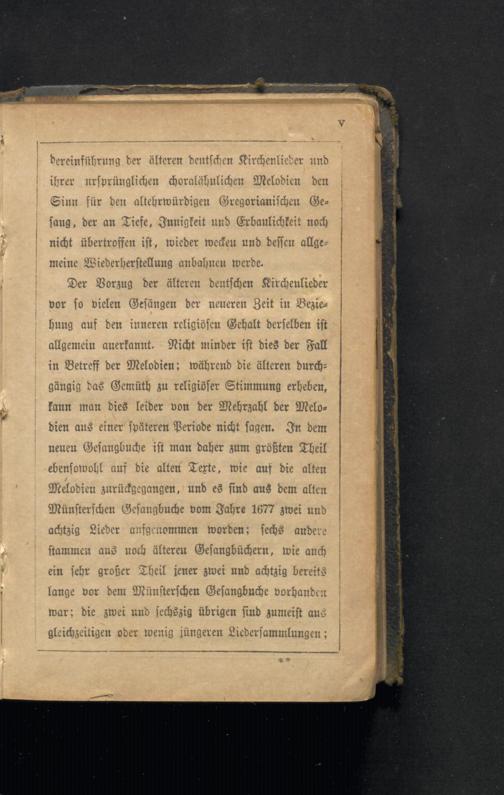 Der Vorzug der älteren deutschen Kirchenlieder vor so vielen Gesängen der neueren Zeit in Beziehung auf den inneren religiösen Gehalt derselben ist allgemein anerkannt. Nicht minder ist dies der Fall in Betreff der Melodien; während die älteren durchgängig das Gemüth zu religiöser Stimmung erheben, kann man dies leider von der Mehrzahl der Melodien aus einer späteren Periode nicht sagen. In dem neuen Gesangbuche ist man daher zum größten Theil ebensowohl auf die alten Terte, wie auf die alten Melodien zurückgegangen, und es sind aus dem alten Münsterschen Gesangbuche vom Jahre 1677 zwei und achtzig Lieder aufgenommen worden; sechs andere stammen aus noch älteren Gesangbüchern, wie auch ein sehr großer Theil jener zwei und achtzig bereits lange vor dem Münsterschen Gesangbuche vorhanden war; die zwei und sechszig übrigen sind zumeist aus gleichzeitigen oder wenig jüngeren Liedersammlungen;