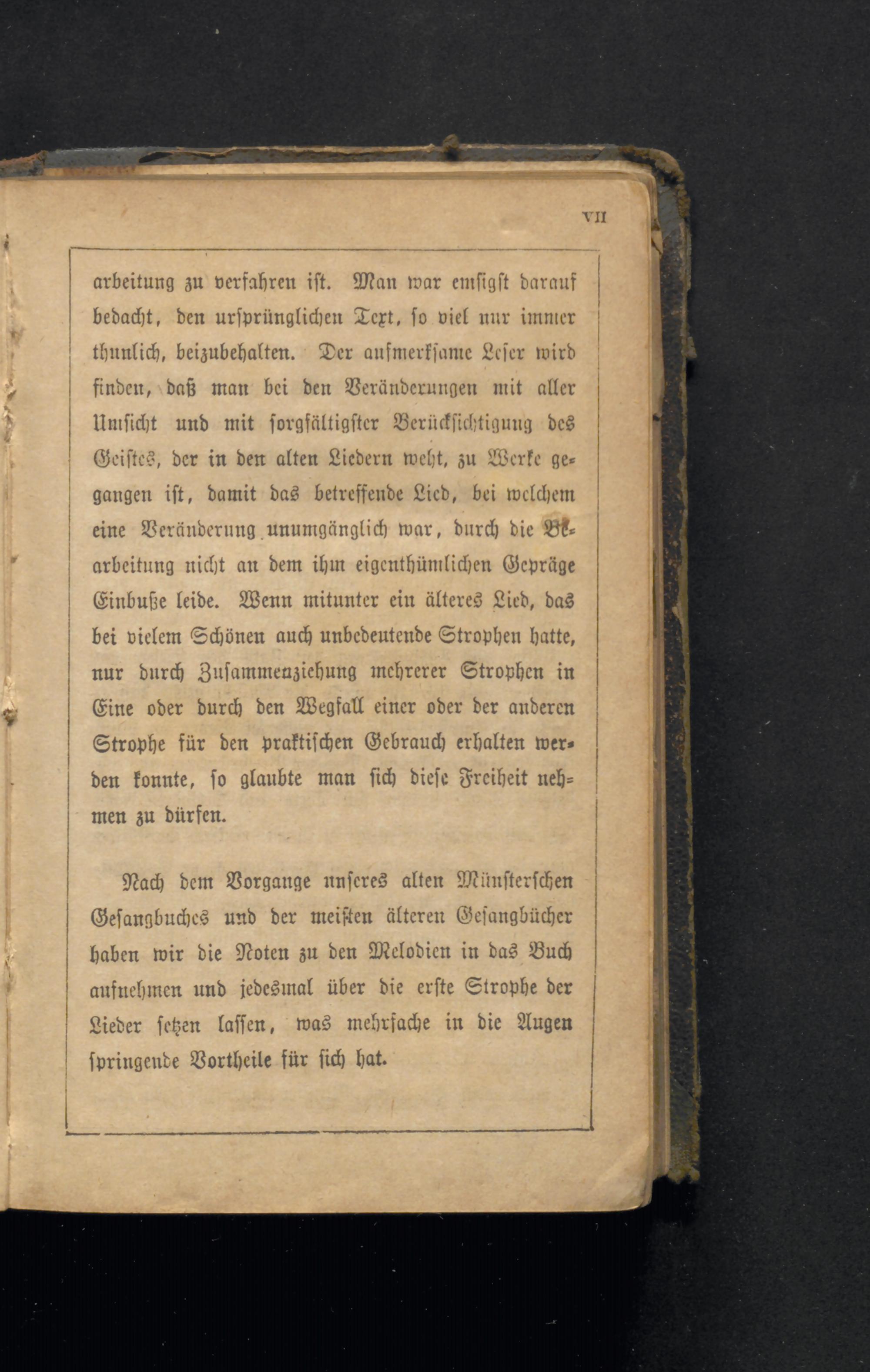 Nach dem Vorgange unseres alten Münsterschen Gesangbuches und der meisten älteren Gesangbücher haben wir die Noten zu den Melodien in das Buch aufnehmen und jedesmal über die erste Strophe der Lieder sehen lassen, was mehrfache in die Augen springende Vortheile für sich hat.