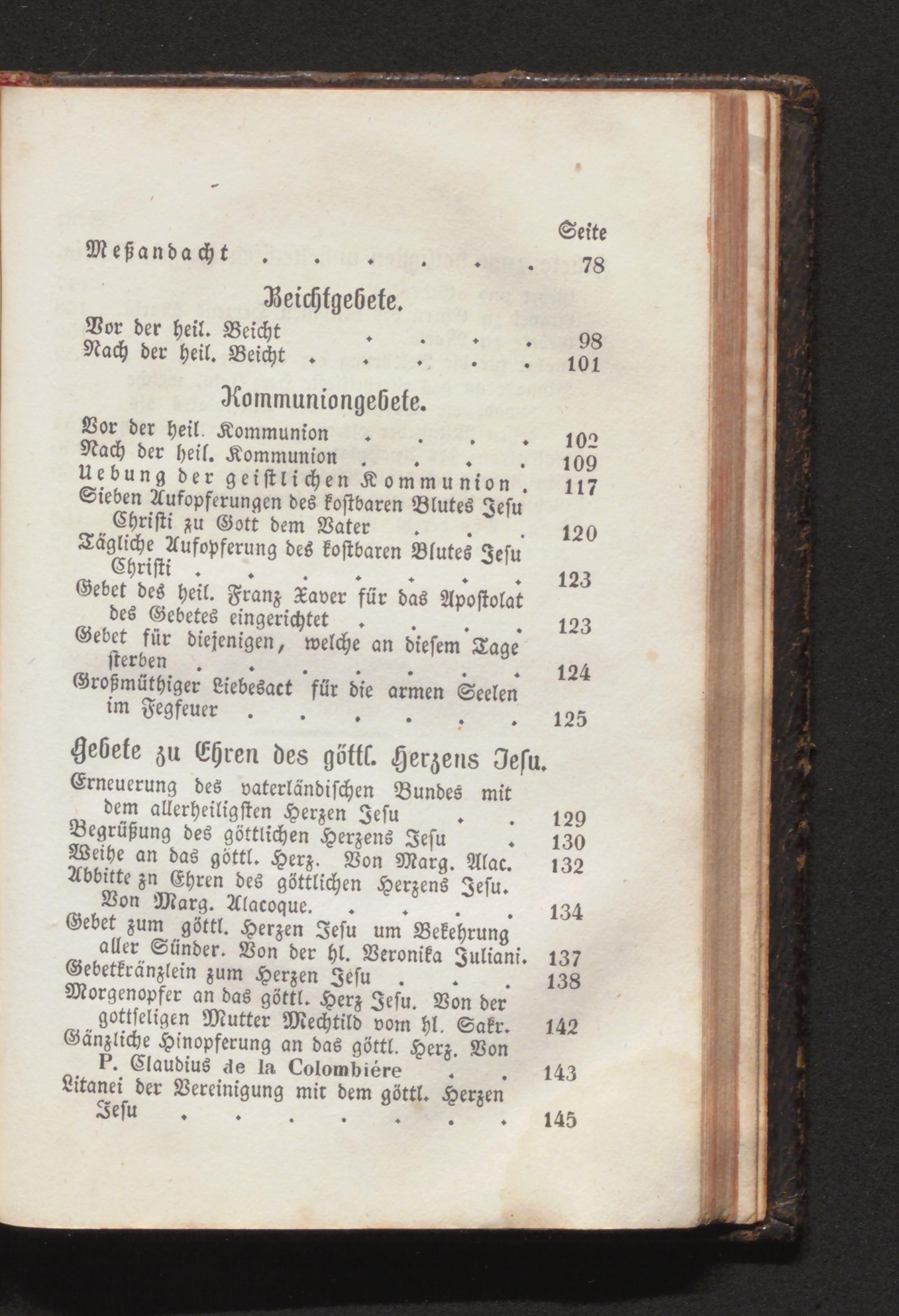 Gebet zum göttl. Herzen Jesu um Bekehrung aller Sünder. Von der hl. Veronika Juliani. Gebetkränzlein zum Herzen Jesu Morgenopfer an das göttl. Herz Jesu. Von der gottseligen Mutter Mechtild vom hl. Sakr. Gänzliche Hinopferung an das göttl. Herz. Von P. Claudius de la Colombiére Litanei der Vereinigung mit dem göttl. Herzen Jesu