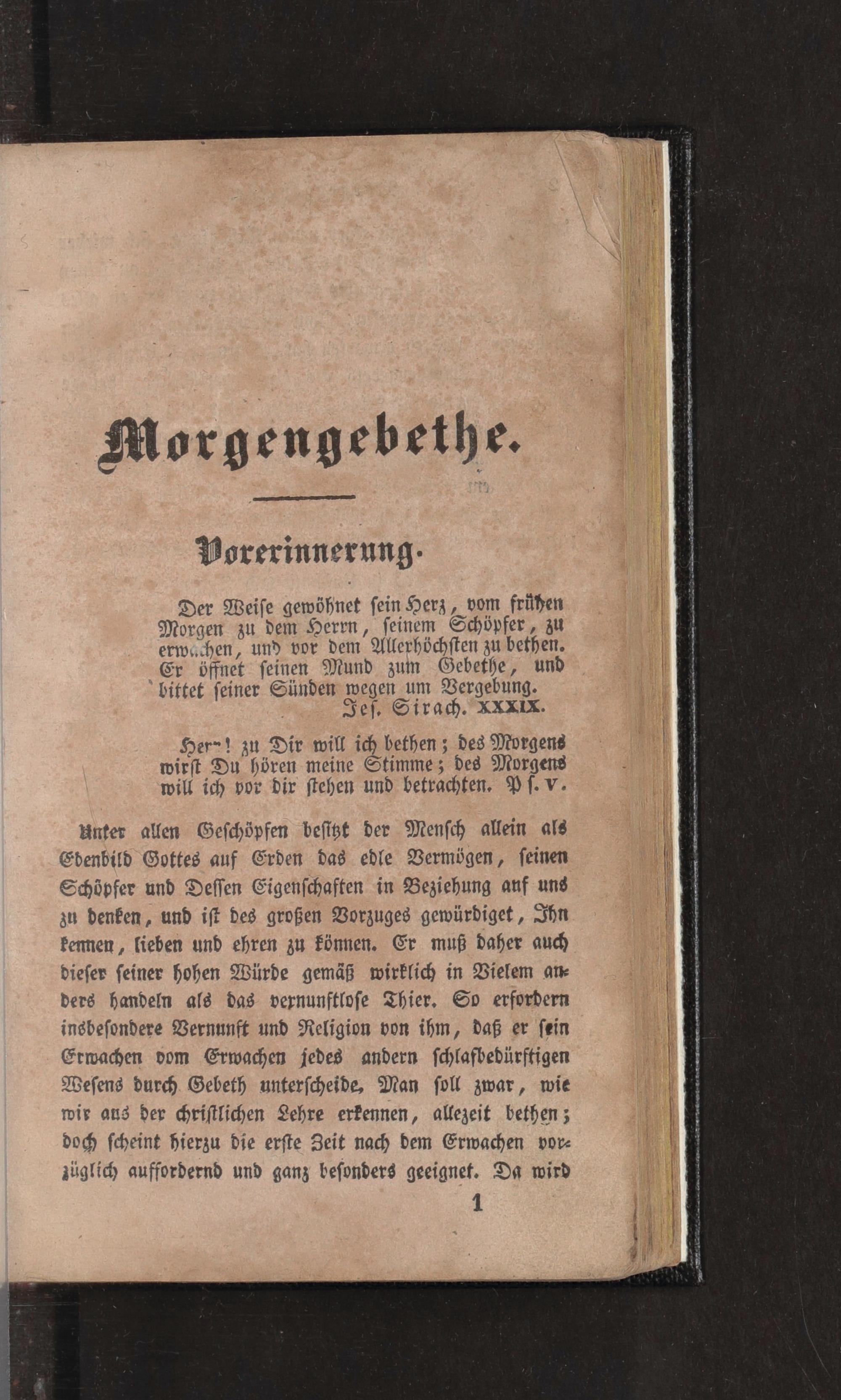 Unter allen Geschöpfen besitzt der Mensch allein als Ebenbild Gottes auf Erden das edle Vermögen, seinen Schöpfer und Dessen Eigenschaften in Beziehung auf uns zu denken, und ist des großen Vorzuges gewürdiget, Ihn Pennen, lieben und ehren zu können. Er muß daher auch dieser seiner hohen Würde gemäß wirklich in Bielem an ders handeln als das vernunftlose Thier. So erfordern insbesondere Bernunft und Religion von ihm, daß er sein Erwachen vom Erwachen jedes andern schlafbedürftigen Wesens durch Gebeth unterscheide, Man soll zwar, wie wir aus der christlichen Lehre erkennen, allezeit bethen; doch scheint hierzu die erste Beit nach dem Erwachen vore züglich auffordernd und ganz besonders geeignet. Da wird 1