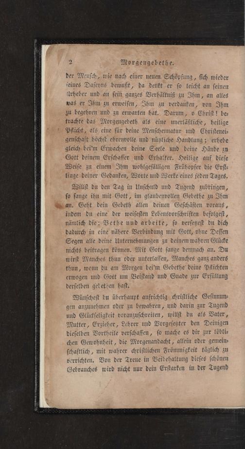Willst du den Tag in Unschuld und Tugend zubringen, so fange ihn mit Gott, im glaubenvollen Gebethe zu Ihm an. Geht dein Gebeth allen deinen Geschäften voraus, indem du eine der weisesten Lebensvorschriften befolgest, nämlich die: Bethe und arbeite, so versetest du dich dadurch in eine nähere Berbindung mit Gott, ohne Desſen Segen alle deine Unternehmungen zu deinem wahren Glücke nichts beitragen können. Mit Gott fange demnach an. Du wirst Manches thun oder unterlassen, Manches ganz anders thun, wenn du am Morgen bei'm Gebethe deine Pflichten erwogen und Gott um Beistand und Gnade zur Erfüllung derselben gel ethen hast.