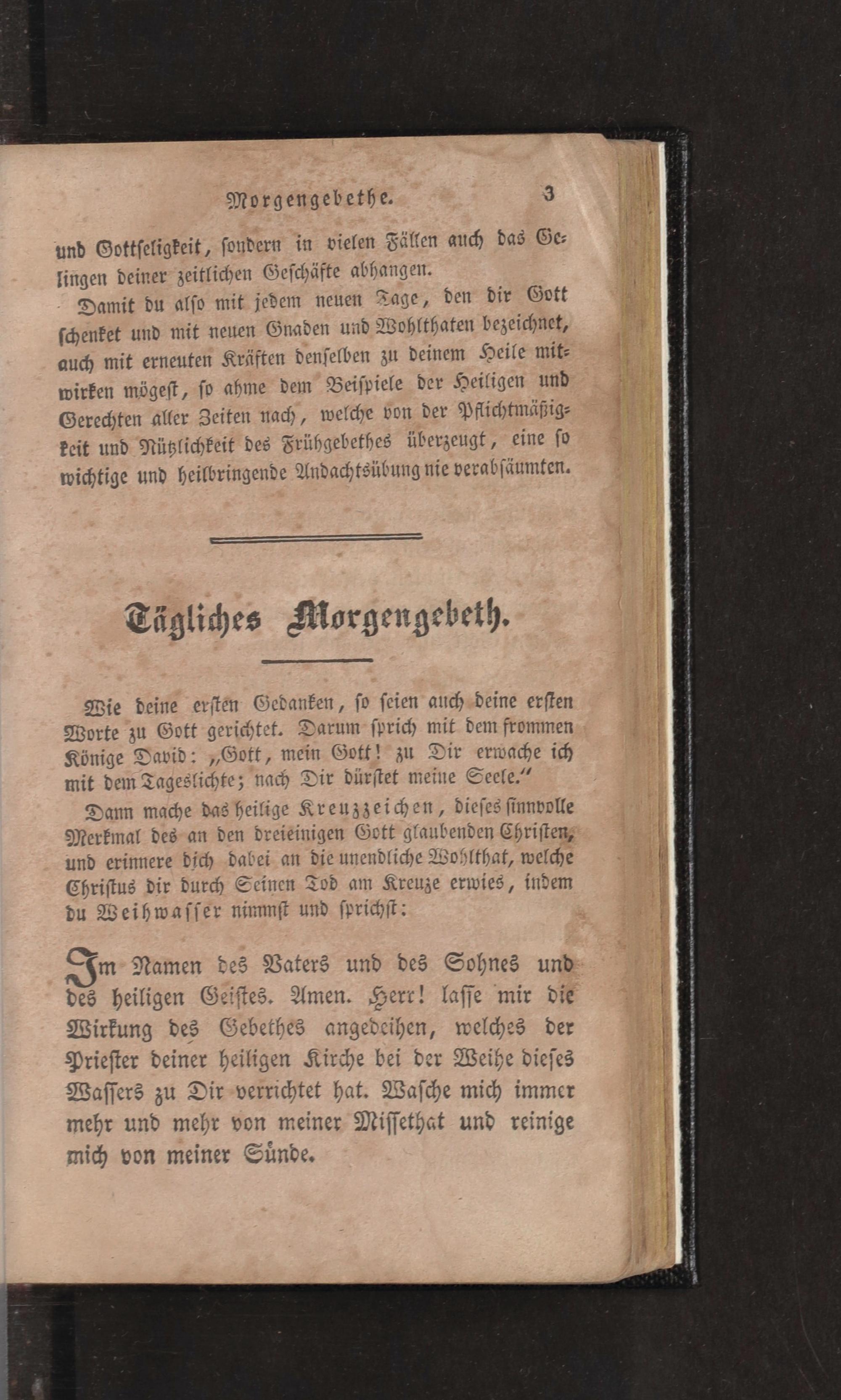 Damit du also mit jedem neuen Tage, den dir Gott schenket und mit neuen Gnaden und Wohlthaten bezeichnet, auch mit erneuten Kräften denselben zu deinem Heile mitwirken mögest, so ahme dem Beispiele der Heiligen und Gerechten aller Zeiten nach, welche von der Pflichtmäßigkeit und Nütlichkeit des Frühgebethes überzeugt, eine ſo wichtige und heilbringende Andachtsübung nie verabsäumten.