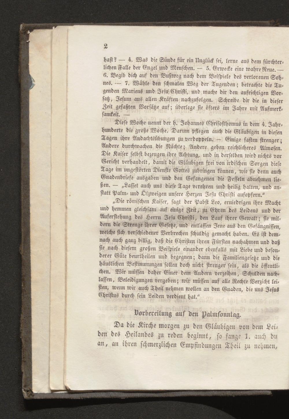 Die römischen Kaiser, sagt der Pabst Leo, erniedrigen ihre Macht und hemmen gleichsam auf einige Zeit, zu Ehren des Leidens und der Auferstehung des Herrn Jesu Christi, den Lauf ihrer Gewalt; sie mildern die Strenge ihrer Gefeße, und entlassen Jene aus den Gefängnissen, welche sich verschiedener Verbrechen schuldig gemacht haben. Es ist demnach auch ganz billig, daß die Christen ihren Fürsten nachahmen und daß einander ebenfalls mit Liebe und beſonderer Güte beurtheilen und begegnen; dann die Familiengesetze und die häuslichen Bestimmungen sollen doch nicht strenger sein, als die öffentlichen. Wir müssen daher Einer dem Andern verzeihen, Schulden nachlassen, Beleidigungen vergeben; wir müssen auf alle Rechte Verzicht leis sten, wenn wir auch Theil nehmen wollen an den Gnaden, die uns Jesus Christus durch sein Leiden verdient hat." left hat, dhistle and tąsi.