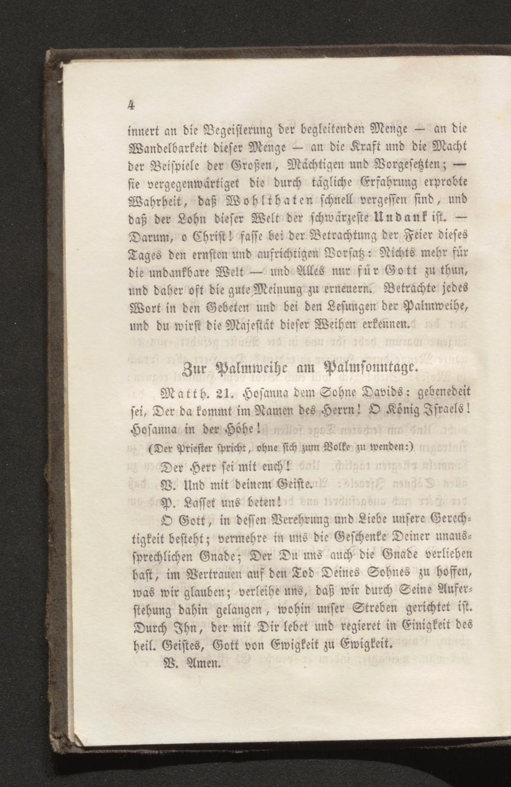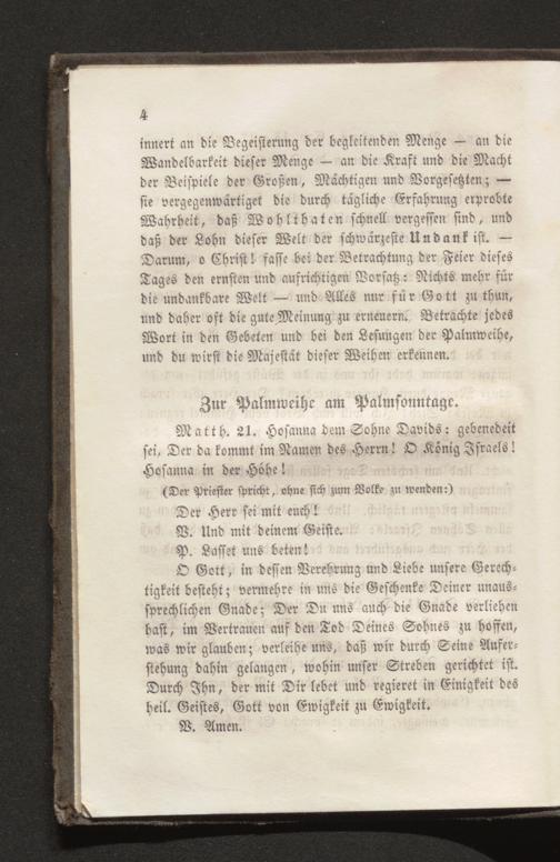 innert an die Begeisterung der begleitenden Menge- an die Wandelbarkeit dieser Menge an die Kraft und die Macht der Beispiele der Großen, Mächtigen und Vorgesetzten; sie vergegenwärtiget die durch tägliche Erfahrung erprobte Wahrheit, daß Wohlthaten schnell vergessen sind, und daß der Lohn dieser Welt der schwärzeste Undank ist. Darum, o Christ! fasse bei der Betrachtung der Feier dieses Tages den ernsten und aufrichtigen Vorsatz: Nichts mehr für die undankbare Welt und Alles nur für Gott zu thun, und daher oft die gute Meinung zu erneuern. Betrachte jedes Wort in den Gebeten und bei den Lesungen der Palmweihe, und du wirst die Majestät dieser Weihen erkennen.d is that dins su vid mi eu di dad, min