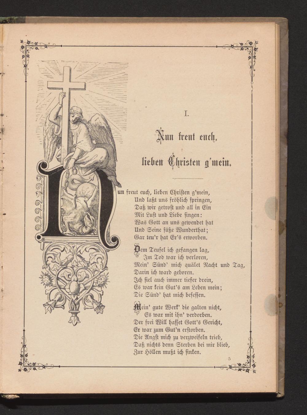 un freut euch, lieben Christen g'mein, Und laßt uns fröhlich springen, Daß wir getrost und all in Ein Mit Lust und Liebe singen: Was Gott an uns gewendet hat Und Seine süße Wunderthat; Gar teu'r hat Er's erworben.