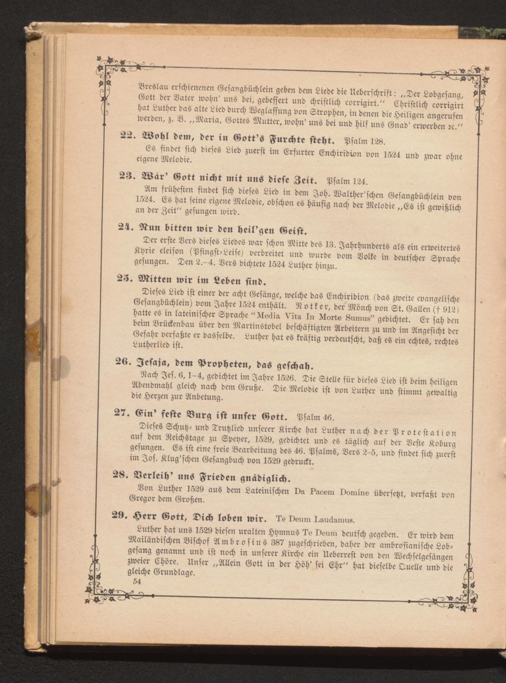 Breslau erschienenen Gesangbüchlein geben dem Liede die Ueberschrift: ,, Der Lobgesang, Gott der Vater wohn' uns bei, gebeffert und christlich corrigirt." Christlich corrigirt hat Luther das alte Lied durch Weglassung von Strophen, in denen die Heiligen angerufen werden, z. B. ,, Maria, Gottes Mutter, wohn' uns bei und hilf uns Gnad' erwerben 2c." 22. Wohl dem, der in Gott's Furchte steht. Psalm 128.