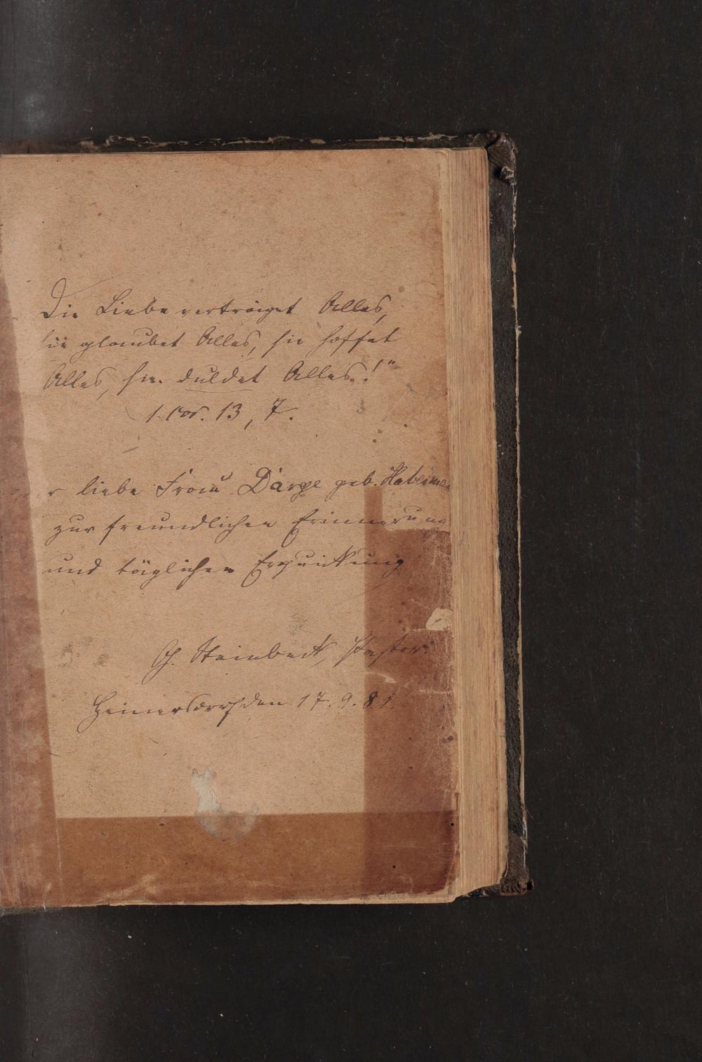 Die Liebe verkräiget belles, ſie glaubet Alles, sie hoffet. Alles sin duldet Alles!!" 1.10. 13, 7.