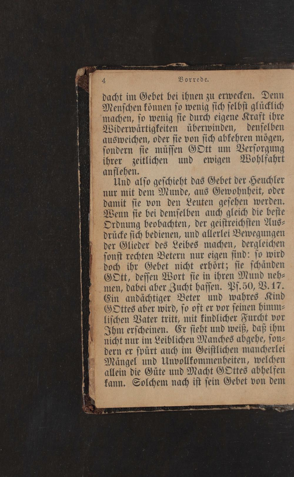 Und also geschieht das Gebet der Heuchler nur mit dem Munde, aus Gewohnheit, oder damit sie von den Leuten gesehen werden. Wenn sie bei demselben auch gleich die beste Ordnung beobachten, der geistreichsten Ausdrücke sich bedienen, und allerlei Bewegungen der Glieder des Leibes machen, dergleichen sonst rechten Betern nur eigen sind: so wird doch ihr Gebet nicht erhört; sie schänden GOtt, dessen Wort sie in ihren Mund nehmen, dabei aber Zucht hassen. Ps.50, V. 17. Ein andächtiger Beter und wahres Kind GOttes aber wird, so oft er vor seinen himmlischen Vater tritt, mit findlicher Furcht vor Ihm erscheinen. Er sieht und weiß, daß ihm nicht nur im Leiblichen Manches abgehe, sondern er spürt auch im Geistlichen mancherlei Mängel und Unvollkommenheiten, welchen allein die Güte und Macht GOttes abhelfen kann. Solchem nach ist sein Gebet von dem