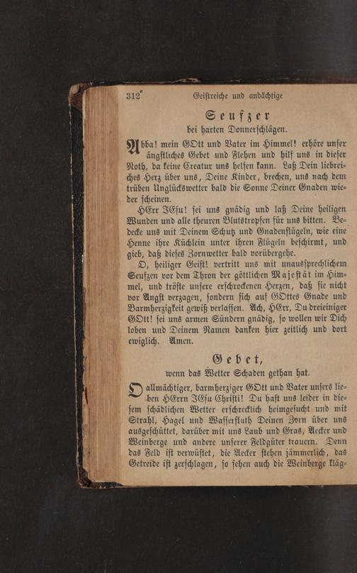 allmächtiger, barmherziger GOtt und Vater unsers lieben HErrn JEfu Chrifti! Du hast uns leider in diesem schädlichen Wetter erschrecklich heimgesucht und mit Strahl, Hagel und Wasserfluth Deinen Zorn über uns ausgeschüttet, darüber mit uns Laub und Gras, Aecker und Weinberge und andere unserer Feldgüter trauern. Denn das Feld ist verwüstet, die Aecker stehen jämmerlich, das Getreide ist zerschlagen, so sehen auch die Weinberge kläg=