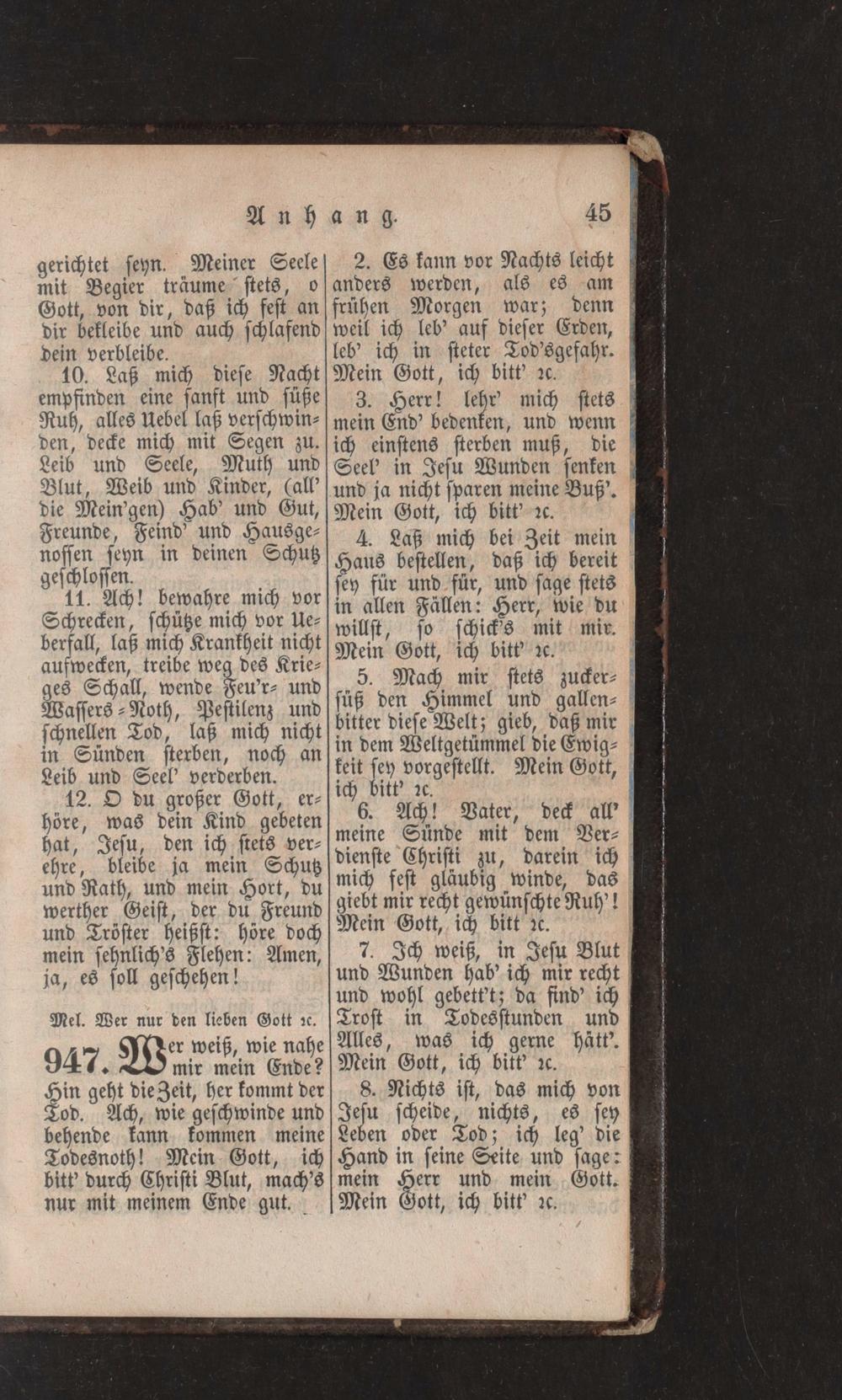 11. Ach! bewahre mich vor Schrecken, schüße mich vor lle berfall, laß mich Krankheit nicht aufwecken, treibe weg des Krie5. Mach mir stets zuckerges Schall, wende Feu'r- und Wassers- Noth, Pestilenz und süß den Himmel und gallenschnellen Tod, laß mich nicht bitter diese Welt; gieb, daß mir in Sünden sterben, noch an in dem Weltgetümmel die EwigLeib und Seel' verderben. keit sey vorgestellt. Mein Gott, ich bitt' 2c.