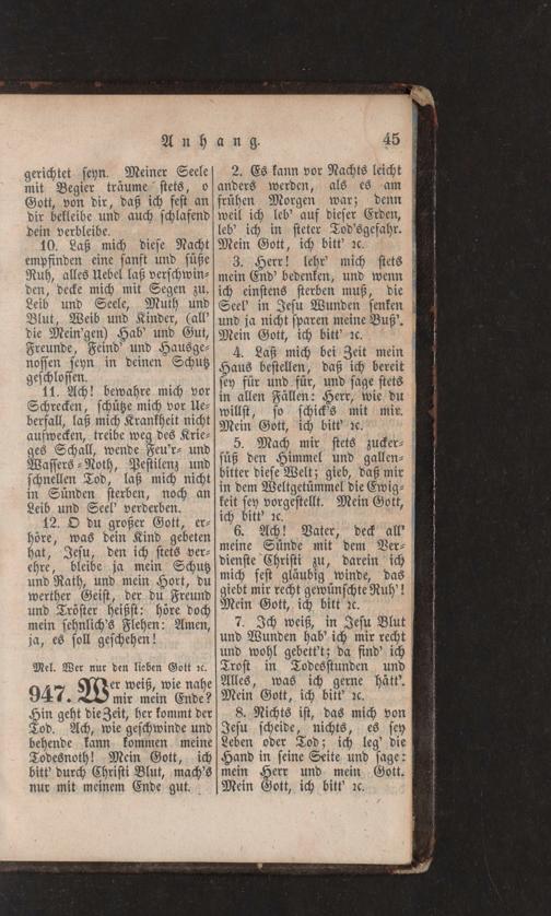 mir mein Ende? Hin geht die Zeit, her kommt der 8. Nichts ist, das mich von Tod. Ach, wie geschwinde und scheide, nichts, es sey behende kann kommen meine Leben oder Tod; ich leg' die Todesnoth! Mein Gott, ich Hand in seine Seite und sage: bitt' durch Christi Blut, mach's mein Herr und mein Gott. nur mit meinem Ende gut. Mein Gott, ich bitt' 2c. end