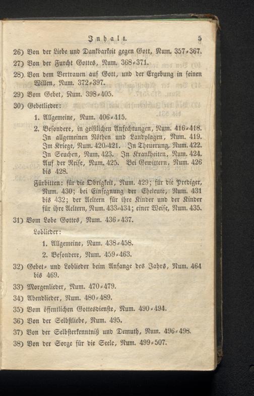 Fürbitten: für die Obrigkeit, Num. 429; für die Prediger, Num. 430; bei Einsegnung der Eheleute, Num. 431 bis 432; der Weltern für ihre Kinder und der Kinder für ihre Aeltern, Num. 433-434; einer Weise, Num. 435. 31) Vom Lobe Gottes, Num. 436-437.