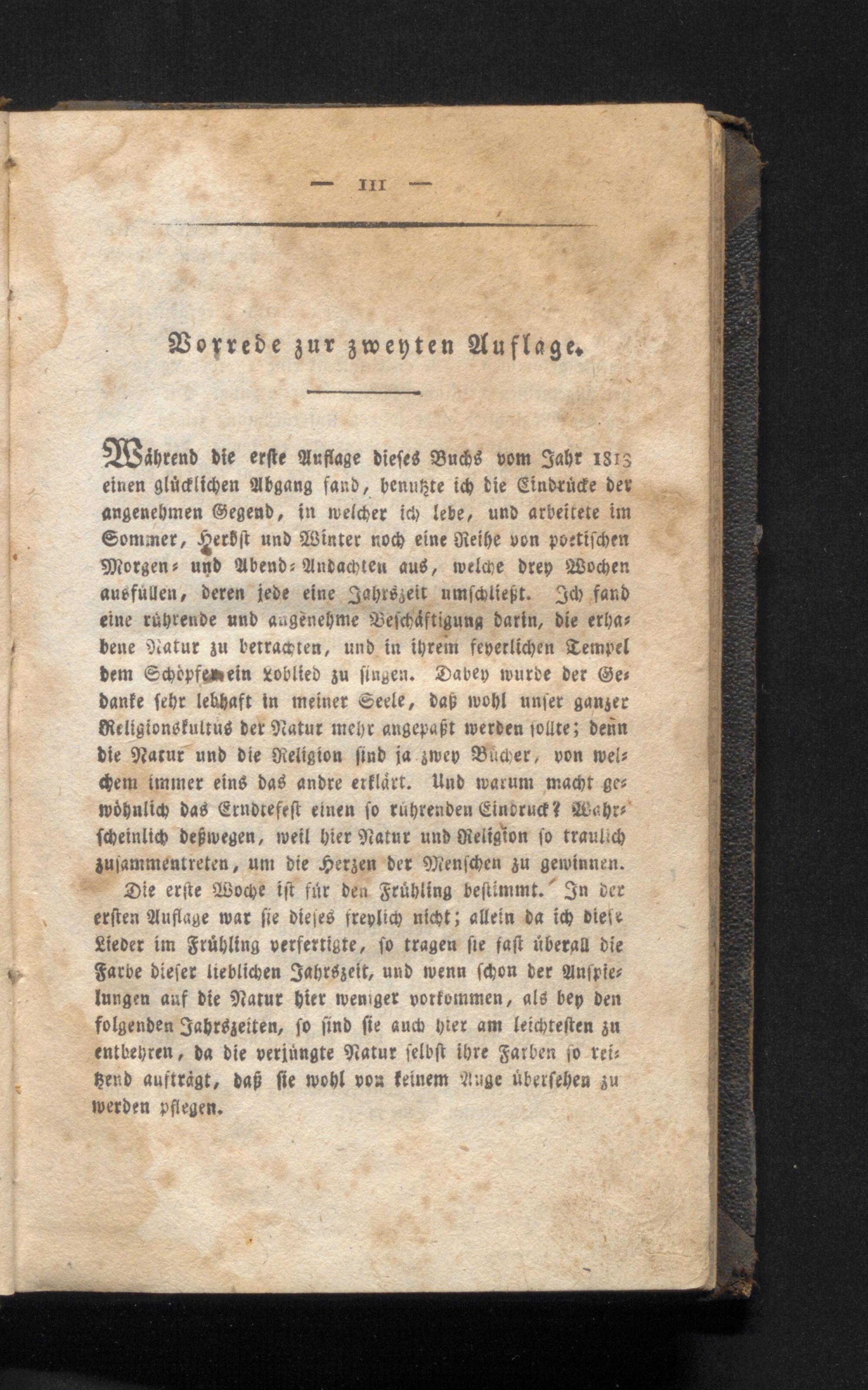 Während die erste Auflage dieses Buchs vom Jahr 1813 einen glücklichen Abgang fand, benußte ich die Eindrücke der angenehmen Gegend, in welcher ich lebe, und arbeitete im Sommer, Herbst und Winter noch eine Reihe von poetischen Morgen und Abend: Andachten aus, welche drey Wochen ausfüllen, deren jede eine Jahrszeit umschließt. Ich fand eine rührende und angenehme Beschäftigung darin, die erhas bene Natur zu betrachten, und in ihrem feverlichen Tempel dem Schöpfemein zoblied zu singen. Dabey wurde der Ges danke sehr lebhaft in meiner Seele, daß wohl unser ganzer Religionskultus der Natur mehr angepaßt werden sollte; denn die Natur und die Religion sind ja zwey Bücher, von wel: chem immer eins das andre erklärt. Und warum macht ges wöhnlich das Erndtefest einen so rührenden Eindruck? Wahrs scheinlich deßwegen, weil hier Natur und Religion so traulich zusammentreten, um die Herzen der Menschen zu gewinnen.