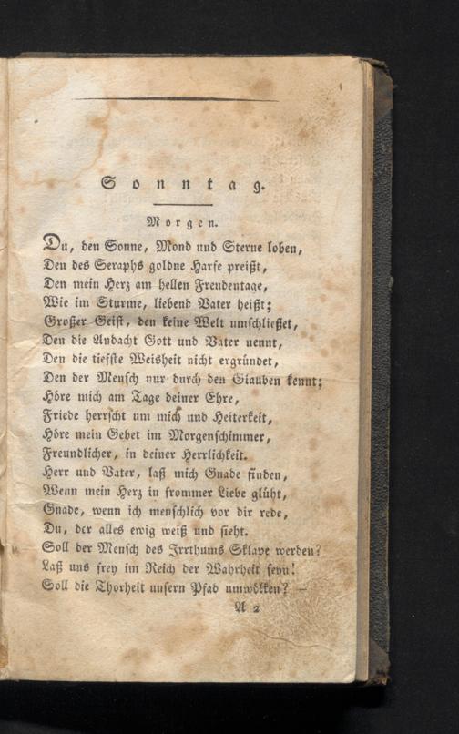Du, den Sonne, Mond und Sterne loben, Den des Seraphs goldne Harfe preißt, Den mein Herz am hellen Freudentage, Wie im Sturme, liebend Vater heißt; Großer Geist, den keine Welt umschließet, Den die Andacht Gott und Vater nennt, Den die tiefste Weisheit nicht ergründet, Den der Mensch nur durch den Glauben fennt; Hdre mich am Tage deiner Ehre, Friede herrscht um mich und Heiterkeit, Hore mein Gebet im Morgenschimmer, Freundlicher, in deiner Herrlichkeit. Herr und Vater, laß mich Gnade finden, Wenn mein Herz in frommer Liebe glüht, Gnade, wenn ich menschlich vor dir rede, Du, der alles ewig weiß und sieht. Soll der Mensch des Frrthums Sklave werden? Laß uns frey im Reich der Wahrheit seyn! Soll die Thorheit unsern Pfad umwelken?