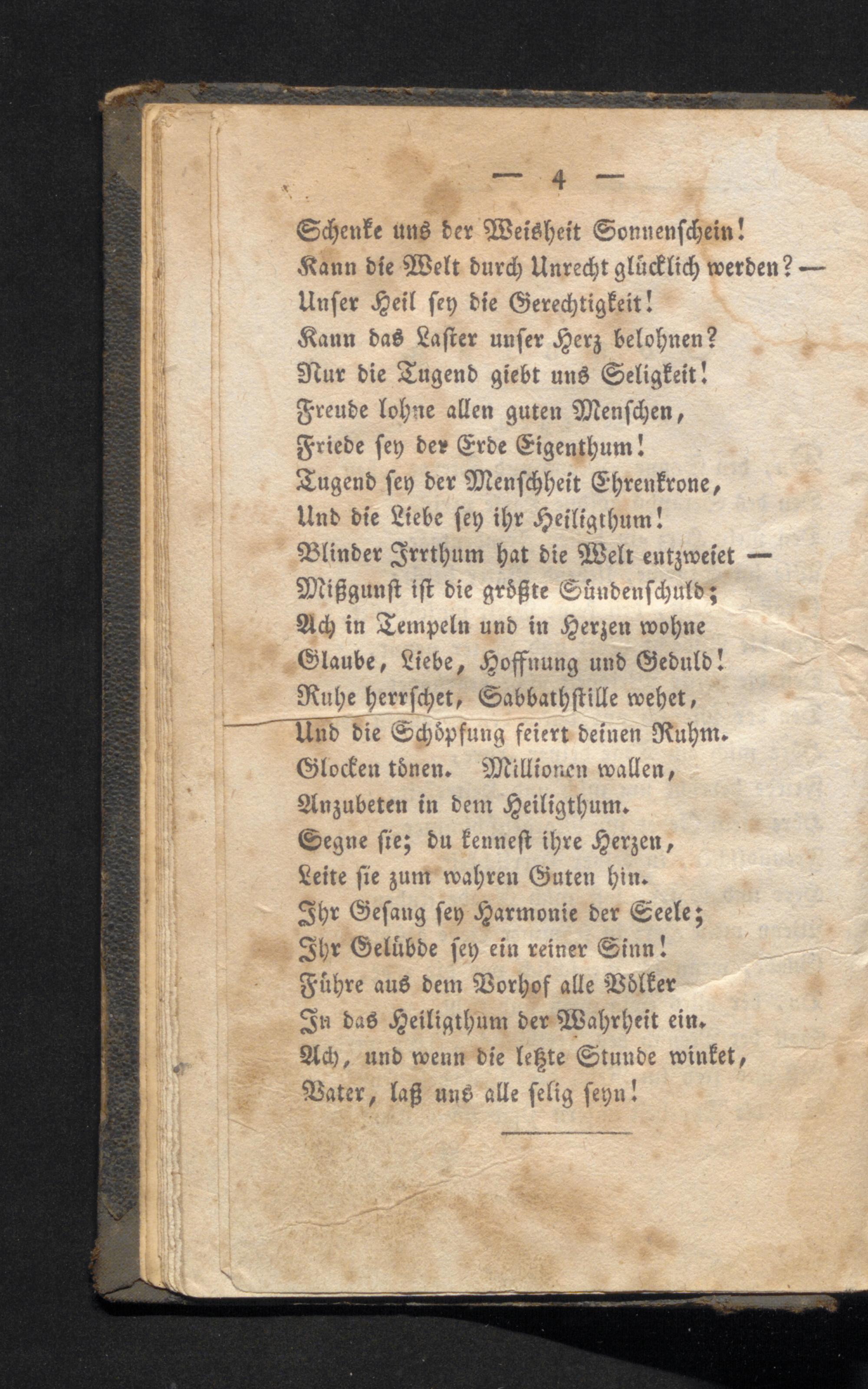 Unser Heil sey die Gerechtigkeit! Kann das Laster unser Herz belohnen? Nur die Tugend giebt uns Seligkeit! Freude lohne allen guten Menschen, Friede sey der Erde Eigenthum! Tugend sey der Menschheit Ehrenkrone, Und die Liebe sey ihr Heiligthum! Blinder Frrthum hat die Welt entzweietMißgunst ist die größte Gündenschuld; Ach in Tempeln und in Herzen wohne Glaube, Liebe, Hoffnung und Geduld! Ruhe herrschet, Sabbathstille wehet, Und die Schöpfung feiert deinen Ruhm. Glocken tonen. Millionen wallen, Anzubeten in dem Heiligthum. Gegne fie; du kenneft ihre Herzen, Leite sie zum wahren Guten hin. Ihr Gesang sey Harmonie der Seele; Ihr Gelübde sey ein reiner Sinn! Führe aus dem Vorhof alle Völker In das Heiligthum der Wahrheit ein. Ach, und wenn die letzte Stunde winket, Bater, laß uns alle selig seyn!