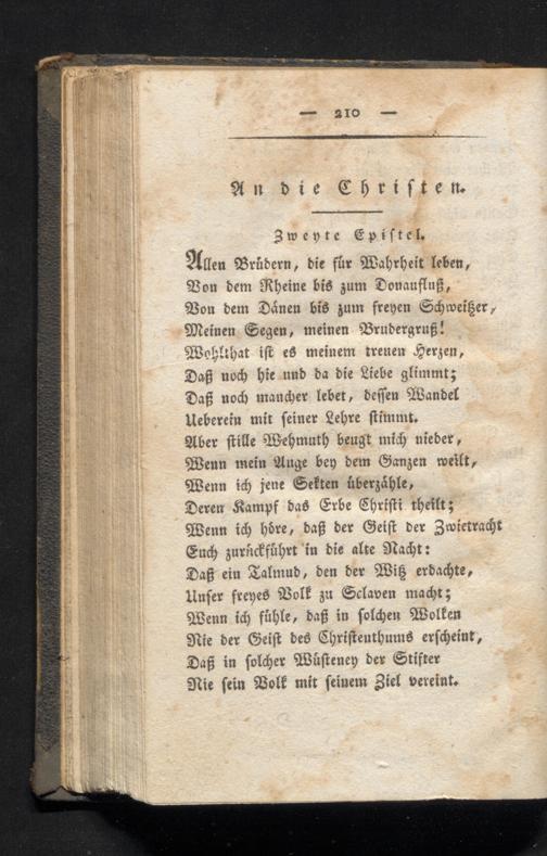 Deren Kampf das Erbe Chrifti theilt; Wenn ich höre, daß der Geist der Zwietracht Euch zurickführt' in die alte Nacht: Daß ein Talmud, den der Wiß erdachte, Unser freyes Volk zu Sclaven macht; Wenn ich fühle, daß in solchen Wolken Nie der Geist des Christenthums erscheint, Daß in solcher Wüsteney der Stifter Nie sein Volk mit seinem Ziel vereint.