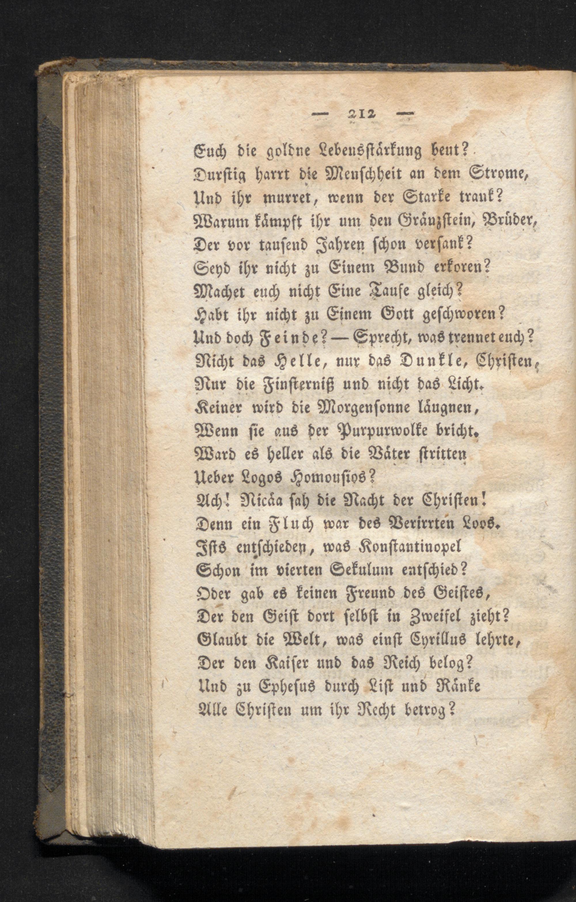 Durstig harrt die Menschheit an dem Strome, Und ihr murret, wenn der Starke trank? Warum kämpft ihr um den Gränzstein, Brüder, Der vor tausend Jahren schon versant? Seyd ihr nicht zu Einem Bund erkoren? Machet euch nicht Eine Taufe gleich? Habt ihr nicht zu Einem Gott geschworen? Und doch Feinde?- Sprecht, was trennet euch)? Nicht das Helle, nur das Dunkle, Christen, Nur die Finsterniß und nicht das Licht. Keiner wird die Morgensonne läugnen, Wenn sie aus der Purpurwolke bricht. Ward es heller als die Båter stritten Ueber Logos Homousios?