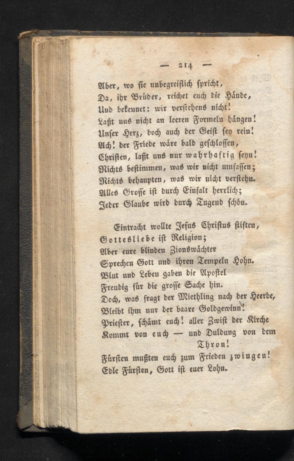Da, ihr Brüder, reichet euch die Hände, Und bekennet: wir verstehens nicht! Laßt uns nicht an leeren Formeln hängen! Unser Herz, doch auch der Geist sey rein! Ach! der Friede wåre bald geschloffen, Christen, laßt uns nur wahrhaftig seyn! Nichts bestimmen, was wir nicht umfaffen; Nichts behaupten, was wir nicht verstehu. Alles Groffe ist durch Einfalt herrlich; Jeder Glaube wird durch Tugend schön.