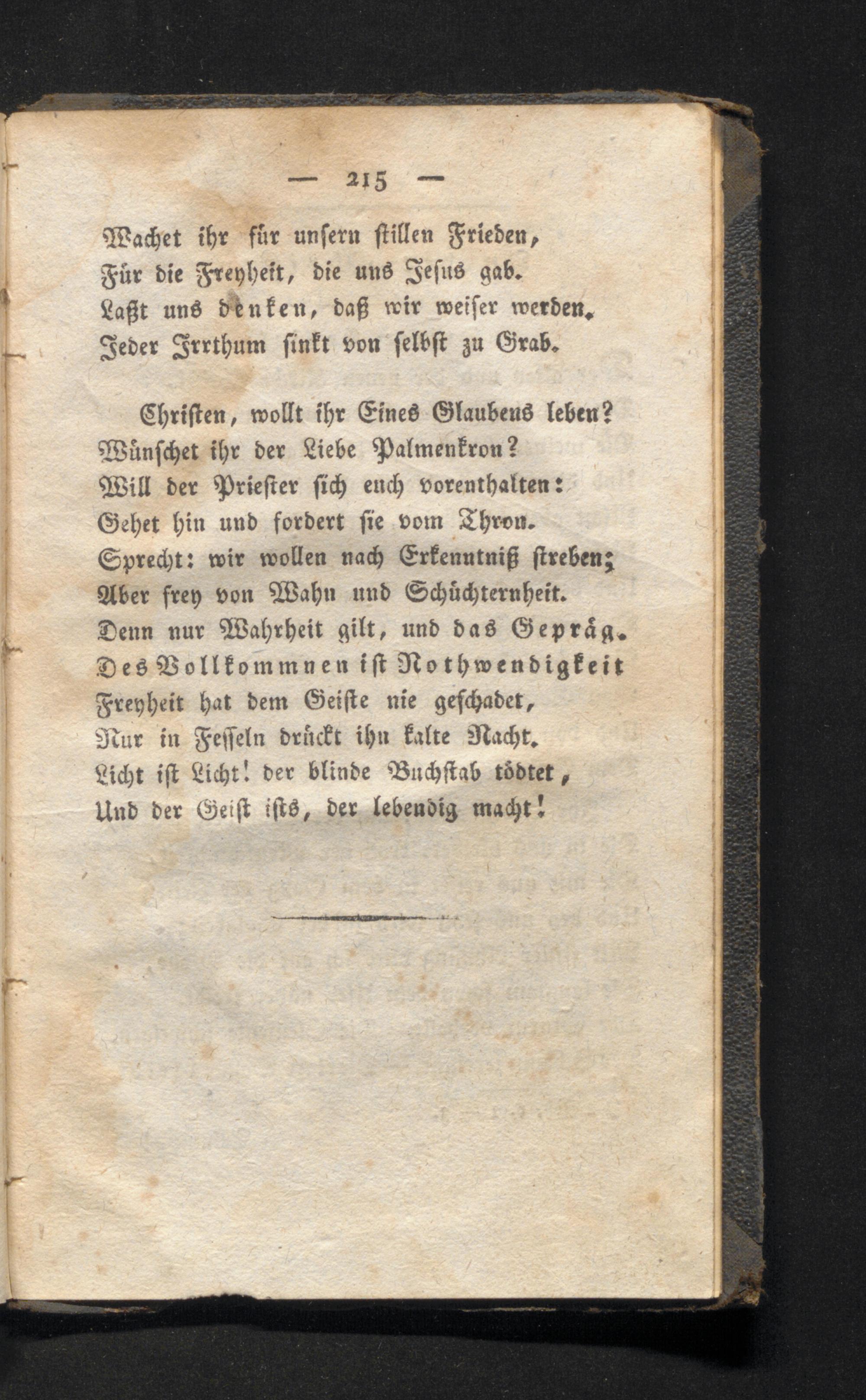 Chriften, wollt ihr Eines Glaubens leben? Wünschet ihr der Liebe Palmenkron? Will der Priester sich euch vorenthalten: Gehet hin und fordert sie vom Chron. Sprecht: wir wollen nach Erkenntniß streben; Aber frey von Wahn und Schüchternheit. Denn nur Wahrheit gilt, und das Gepräg. Des Vollkommnen ist Nothwendigkeit Freyheit hat dem Geifte nie geschadet, Nur in Fesseln drückt ihn kalte Nacht. Licht ist Licht! der blinde Buchstab tödtet, Und der Geist ists, der lebendig macht!